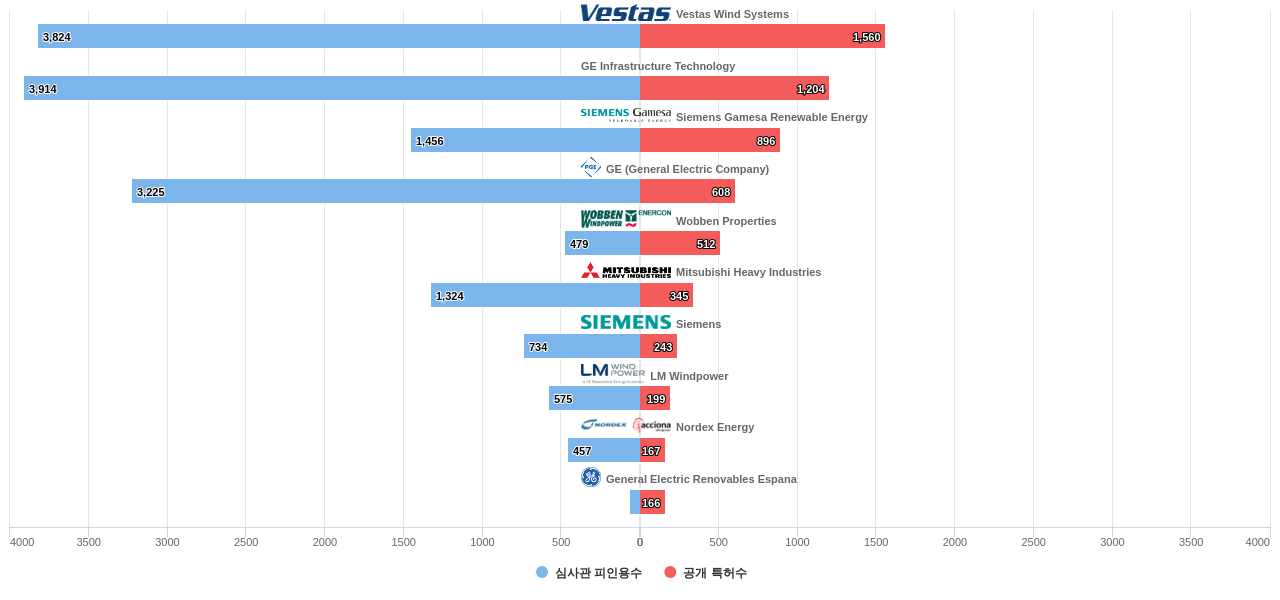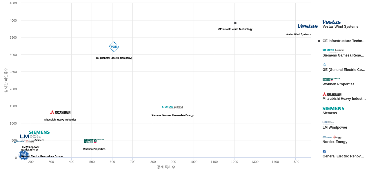 또한 Vestas Wind Systems는 공개 특허수(1,560건), 등록 특허수(1,244건), 공개 특허수 점유율(점유율_공개)(8.64%), 심판 특허수(2건), 해외 특허 패밀리수(해외 Fam.)(6,142개), Nordex Energy는 집중률(96.5%), GE Infrastructure Technology는 매입 특허수(272건), 심사관 피인용수(3,914회), 심사관 피인용수 점유율(점유율_FC-E)(17.1%), GE (General Electric Company)은(는) 소송 특허수(3건)에서 1위 입니다. Siemens Gamesa Renewable Energy는 매입 특허수(64건), 소송 특허수(2건), 심판 특허수(2건), Wobben Properties는 해외 특허 패밀리수(해외 Fam.)(4,483개)에서 2위 입니다. General Electric Renovables Espana는 집중률(81.0%), Mitsubishi Heavy Industries는 소송 특허수(2건)에서 3위 입니다. LM Windpower은 집중률(78.0%), Siemens는 매입 특허수(16건)에서 5위 입니다.