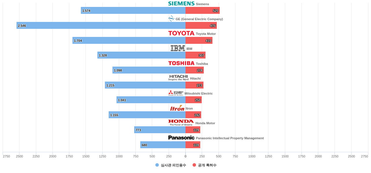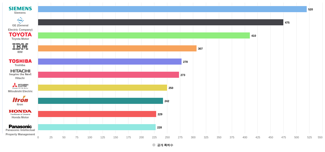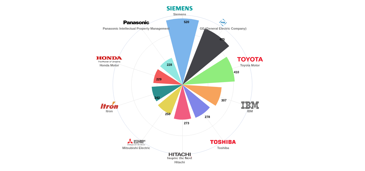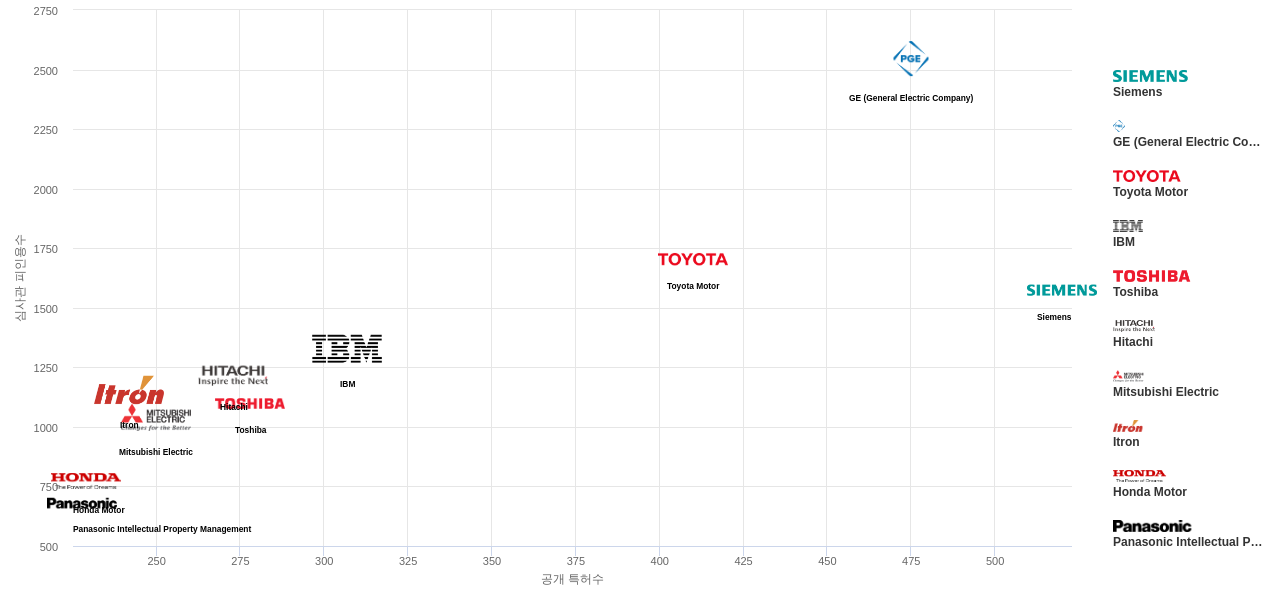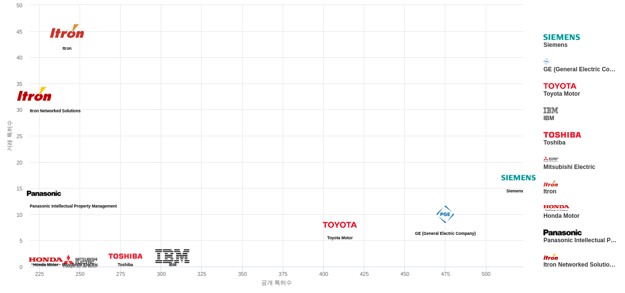 또한 Siemens는 공개 특허수(520건), 등록 특허수(404건), 공개 특허수 점유율(점유율_공개)(1.92%), 해외 특허 패밀리수(해외 Fam.)(2,274개), Itron은 집중률(30.3%), 매입 특허수(45건), GE (General Electric Company)은(는) 소송 특허수(1건), 심사관 피인용수(2,546회), 심사관 피인용수 점유율(점유율_FC-E)(3.13%)에서 1위 입니다. Toyota Motor는 등록 특허수(326건), 심사관 피인용수(1,704회), 심사관 피인용수 점유율(점유율_FC-E)(2.09%)에서 2위 입니다. Panasonic Intellectual Property Management는 매입 특허수(14건)에서 3위 입니다. IBM은(는) 공개 특허수(307건), 등록 특허수(272건), 공개 특허수 점유율(점유율_공개)(1.13%), 심사관 피인용수(1,328회), 심사관 피인용수 점유율(점유율_FC-E)(1.63%)에서 4위 입니다. Toshiba는 공개 특허수(278건), 공개 특허수 점유율(점유율_공개)(1.03%), 해외 특허 패밀리수(해외 Fam.)(810개), Mitsubishi Electric은 등록 특허수(206건), Hitachi는 심사관 피인용수(1,215회), 심사관 피인용수 점유율(점유율_FC-E)(1.49%)에서 5위 입니다.