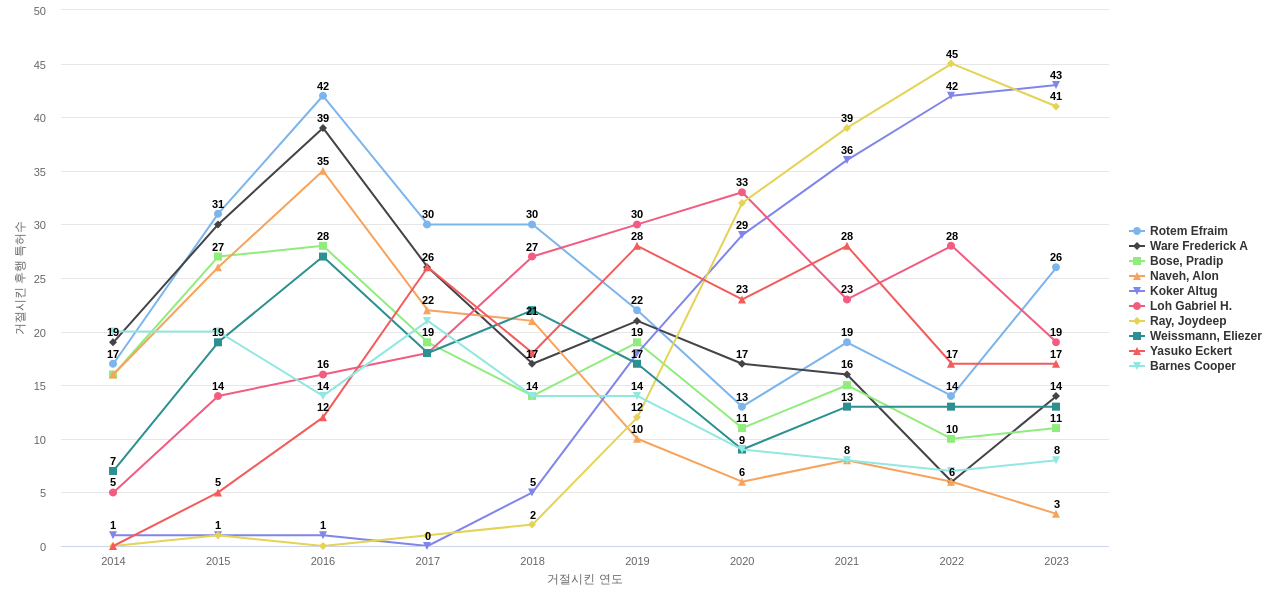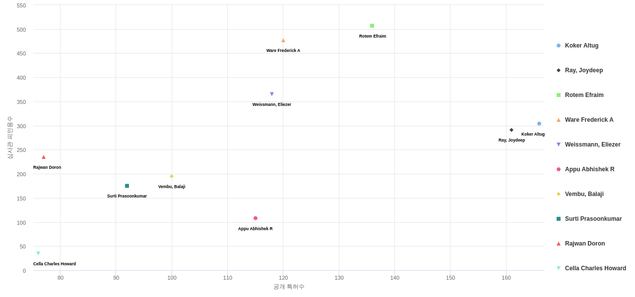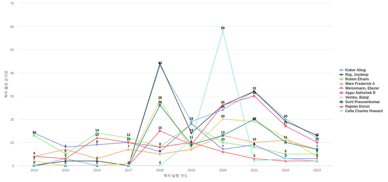 또한 Koker Altug는 발명 특허수(공개 특허수)(166건), 등록 특허수(147건), 공개 특허수 점유율(점유율_공개)(0.44%), Rajwan Doron은 집중률(86.5%), 소송 특허수(5건), Rotem Efraim은 거래 특허수(27건), 심판 특허수(2건), 심사관 피인용수(507회), 심사관 피인용수 점유율(점유율_FC-E)(0.5%), Ray, Joydeep는 해외 특허 패밀리수(해외 Fam.)(224개)에서 1위 입니다. Weissmann, Eliezer은 거래 특허수(25건), 심판 특허수(2건), Ware Frederick A는 심사관 피인용수(477회), 심사관 피인용수 점유율(점유율_FC-E)(0.47%)에서 2위 입니다. Appu Abhishek R는 해외 특허 패밀리수(해외 Fam.)(175개)에서 3위 입니다. Cella Charles Howard는 집중률(53.5%)에서 4위 입니다. Vembu, Balaji는 집중률(35.2%)에서 5위 입니다.