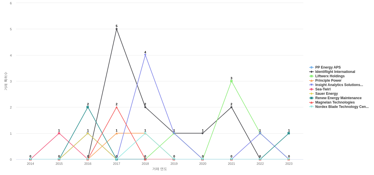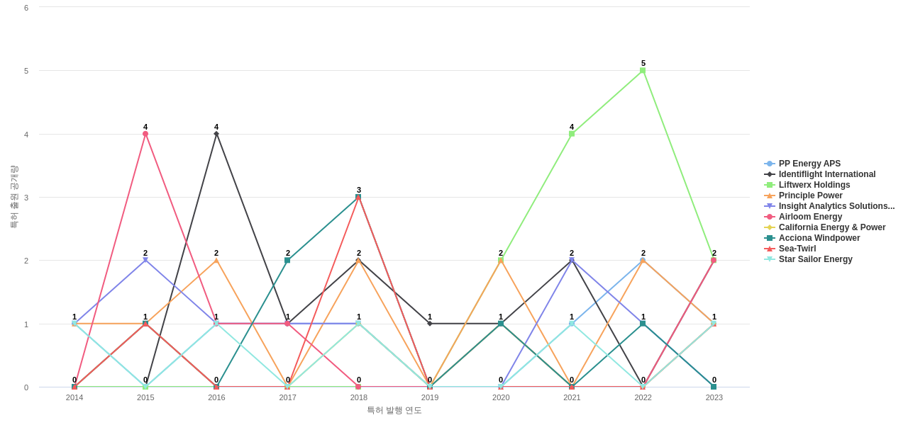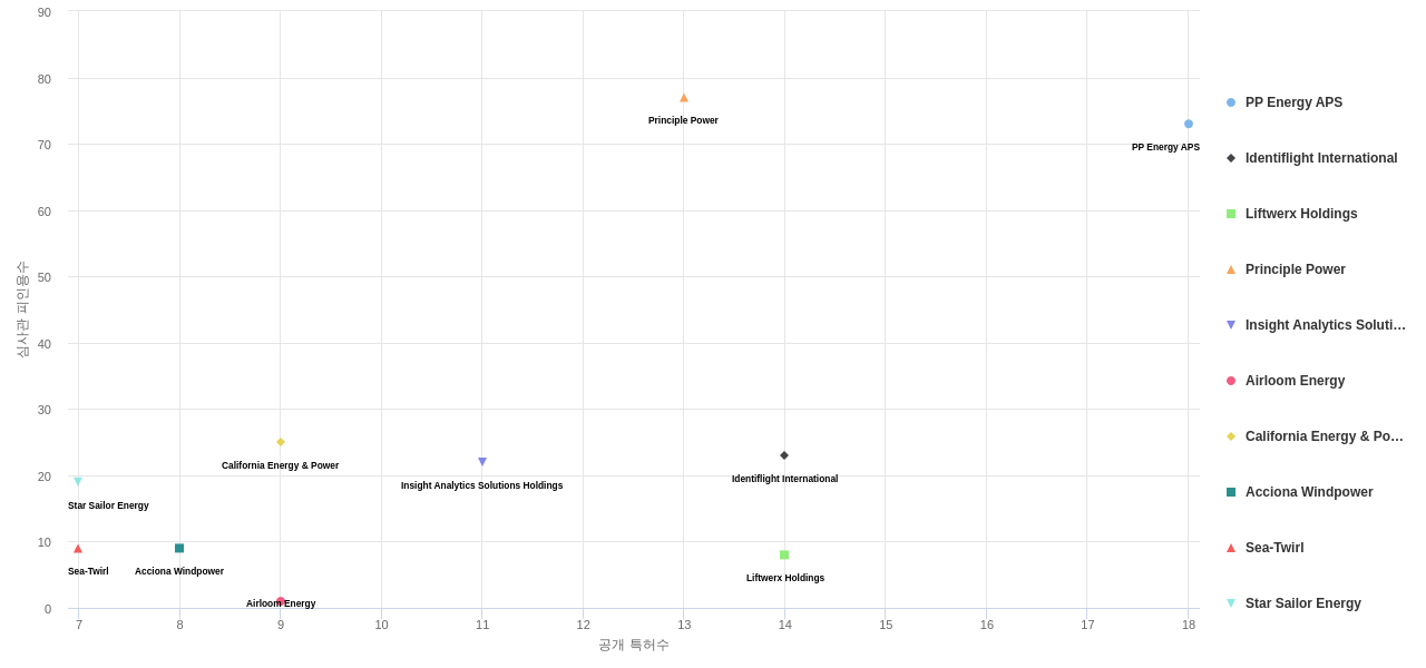 또한 PP Energy APS은(는) 공개 특허수(18건), 등록 특허수(11건), 공개 특허수 점유율(점유율_공개)(0.09%), 집중률(100.0%), 해외 특허 패밀리수(해외 Fam.)(94개), Identiflight International은 매입 특허수(12건), Principle Power는 심사관 피인용수(77회), 심사관 피인용수 점유율(점유율_FC-E)(0.27%)에서 1위 입니다. Insight Analytics Solutions Holdings는 매입 특허수(6건)에서 2위 입니다. Liftwerx Holdings는 공개 특허수(14건), 등록 특허수(11건), 공개 특허수 점유율(점유율_공개)(0.07%), 집중률(100.0%), 매입 특허수(5건), California Energy & Power는 심사관 피인용수(25회), 심사관 피인용수 점유율(점유율_FC-E)(0.09%)에서 3위 입니다. Sea-Twirl은 매입 특허수(2건)에서 5위 입니다.