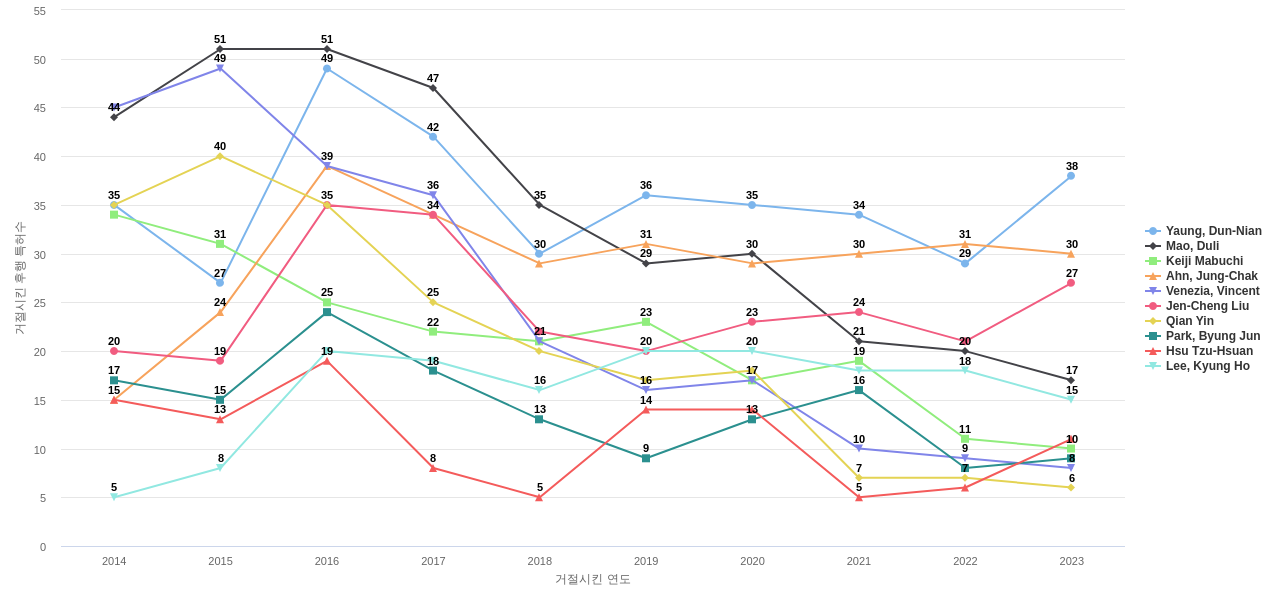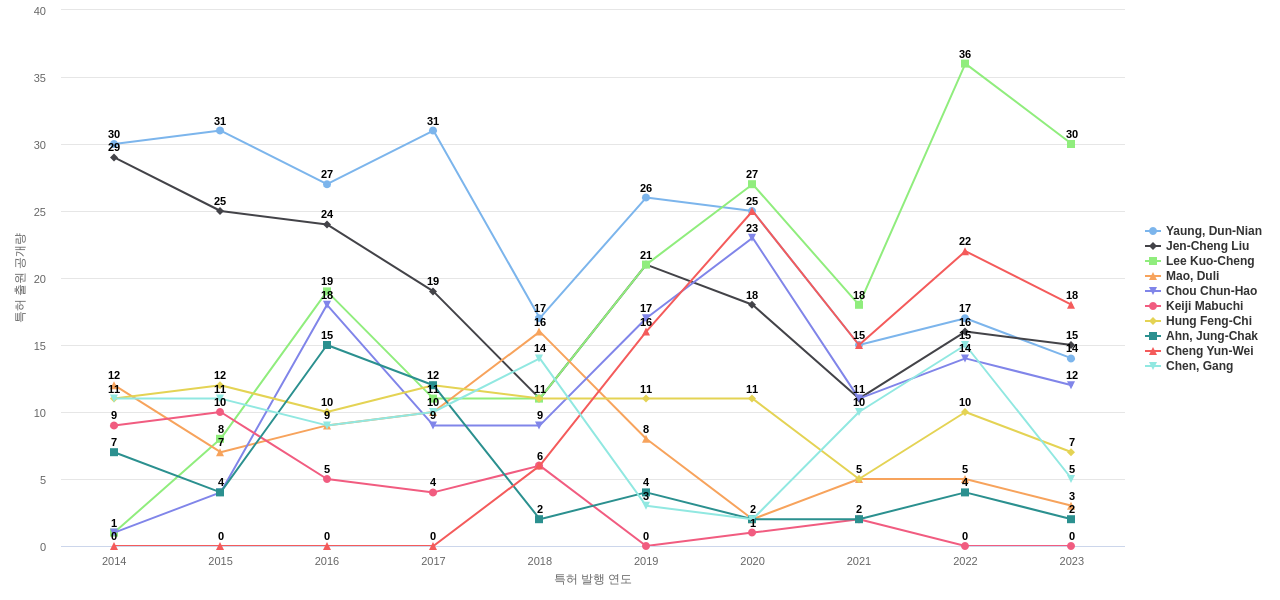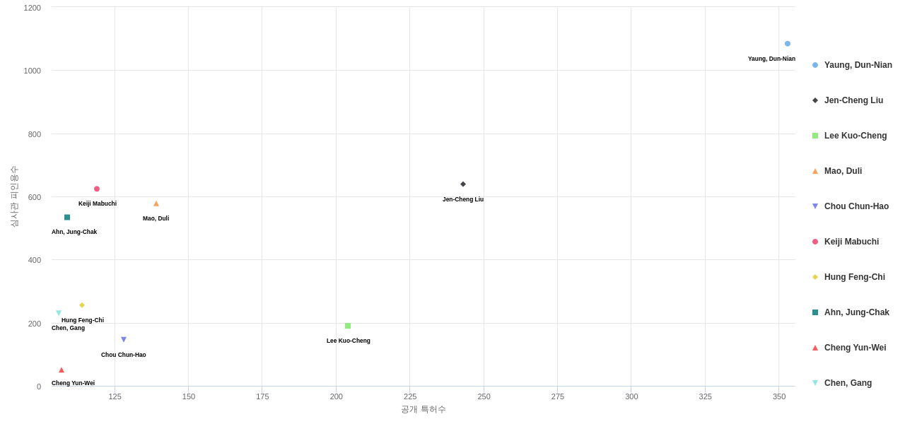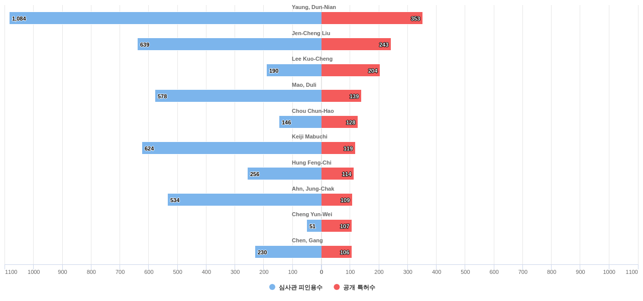 또한 Yaung, Dun-Nian은 발명 특허수(공개 특허수)(353건), 등록 특허수(300건), 공개 특허수 점유율(점유율_공개)(1.79%), 거래 특허수(9건), 심사관 피인용수(1,084회), 심사관 피인용수 점유율(점유율_FC-E)(3.21%), 해외 특허 패밀리수(해외 Fam.)(382개), Chou Chun-Hao는 집중률(84.8%), Keiji Mabuchi는 소송 특허수(3건)에서 1위 입니다. Jen-Cheng Liu는 발명 특허수(공개 특허수)(243건), 등록 특허수(207건), 공개 특허수 점유율(점유율_공개)(1.23%), 거래 특허수(7건), 심사관 피인용수(639회), 심사관 피인용수 점유율(점유율_FC-E)(1.89%), 해외 특허 패밀리수(해외 Fam.)(288개), Lee Kuo-Cheng은 집중률(81.0%)에서 2위 입니다. Chen, Gang은 집중률(80.9%), Hung Feng-Chi는 거래 특허수(5건), Mao, Duli는 해외 특허 패밀리수(해외 Fam.)(227개)에서 3위 입니다. Cheng Yun-Wei는 집중률(77.5%), Ahn, Jung-Chak는 심사관 피인용수(534회), 심사관 피인용수 점유율(점유율_FC-E)(1.58%)에서 5위 입니다.