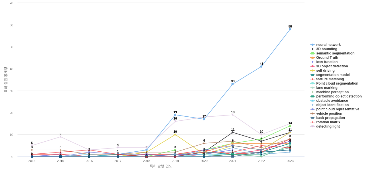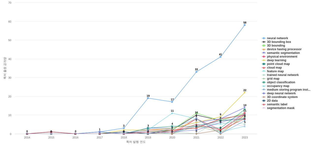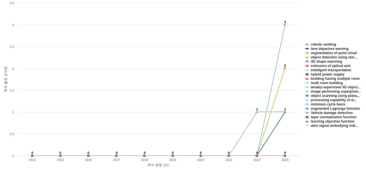1) [기술 기획 조직]/[IP 조직] 고객, 주요 기업, 경쟁사, 밸류 체인이나 공급망 구성 기업의 3차원 포인트 클라우드 분야의 특허에 포함된 신규 등장 키워드나 급성장하고 있는 키워드(제품-부품, 소재-물질, 기능-작용, 컨셉 등)를 i) 파악하고, ii) 체계적으로 기술(테크) 센싱과 기술 마켓 센싱을 수행하며, iii) 그 결과를 필요 조직에 전파해야 하지 않을까요?