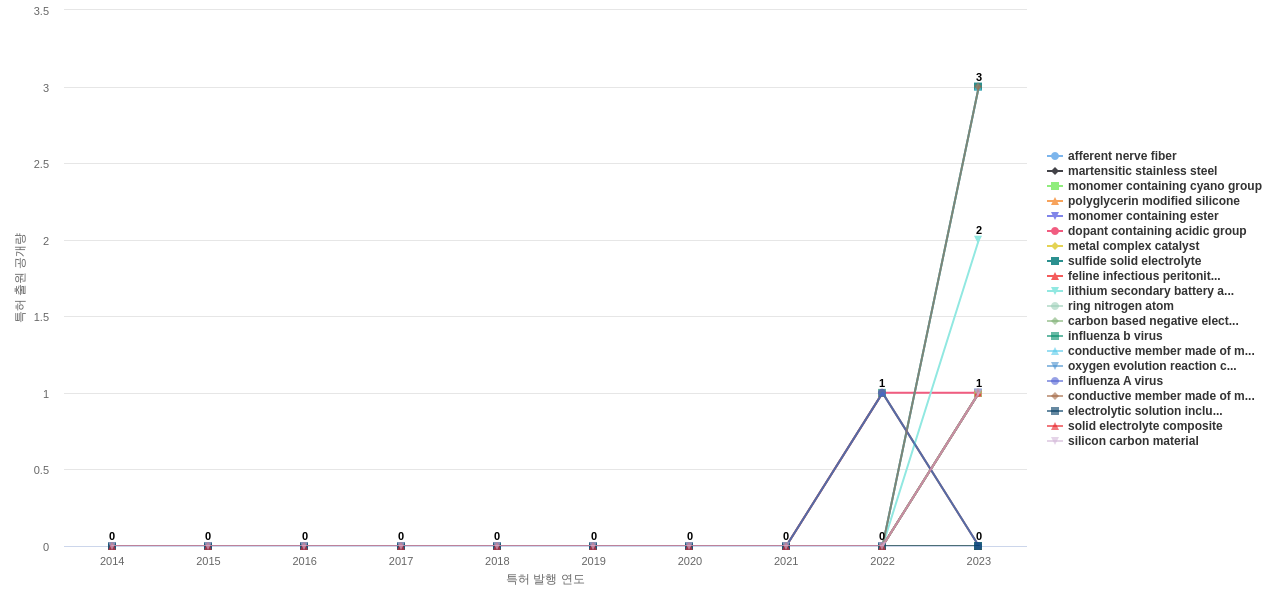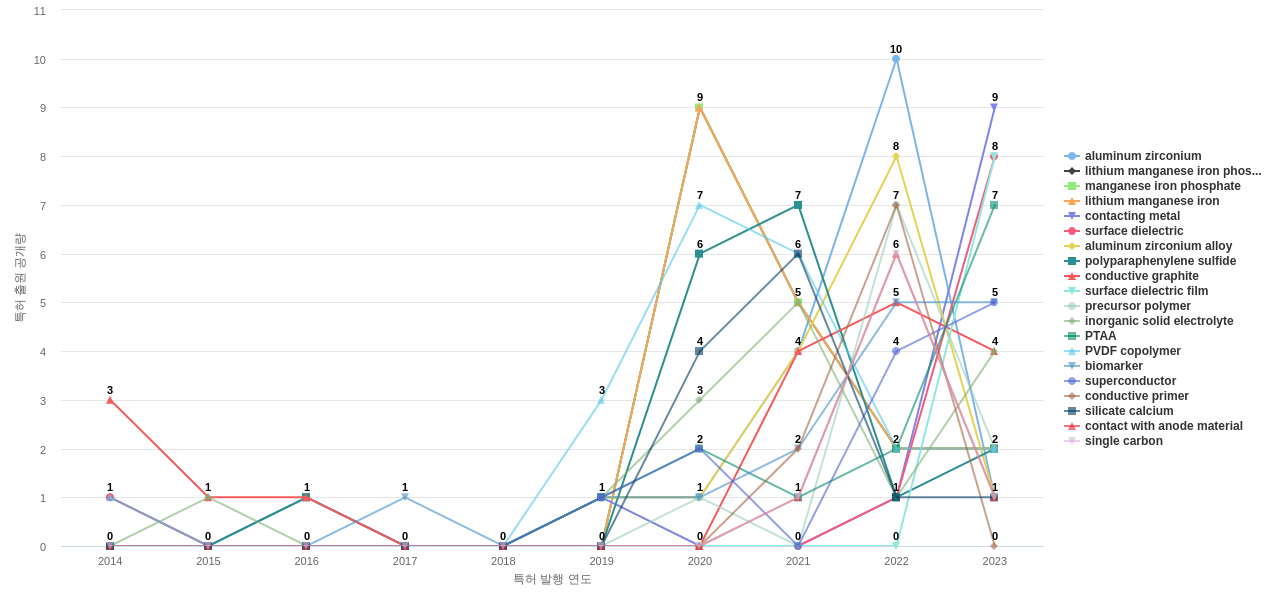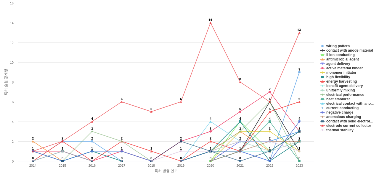 1) [기술 기획 조직]/[IP 조직] 고객, 주요 기업, 경쟁사, 밸류 체인이나 공급망 구성 기업의 전도성 고분자 분야의 특허에 포함된 신규 등장 키워드나 급성장하고 있는 키워드(제품-부품, 소재-물질, 기능-작용, 컨셉 등)를 i) 파악하고, ii) 체계적으로 기술(테크) 센싱과 기술 마켓 센싱을 수행하며, iii) 그 결과를 필요 조직에 전파해야 하지 않을까요?
