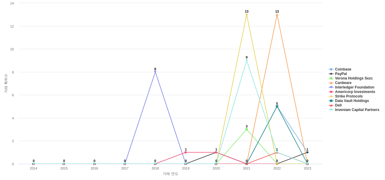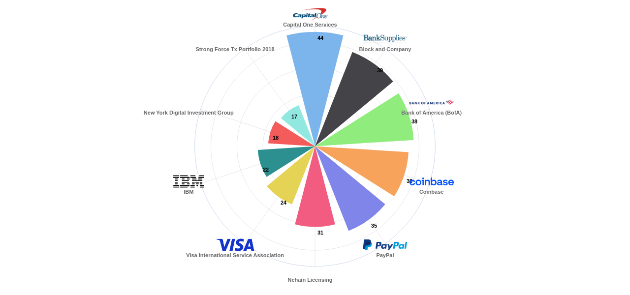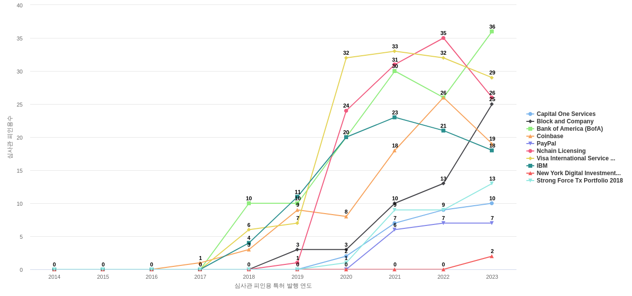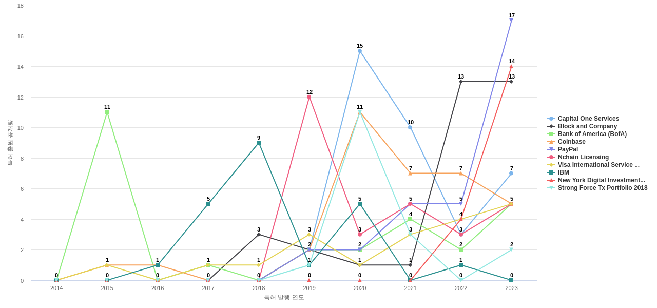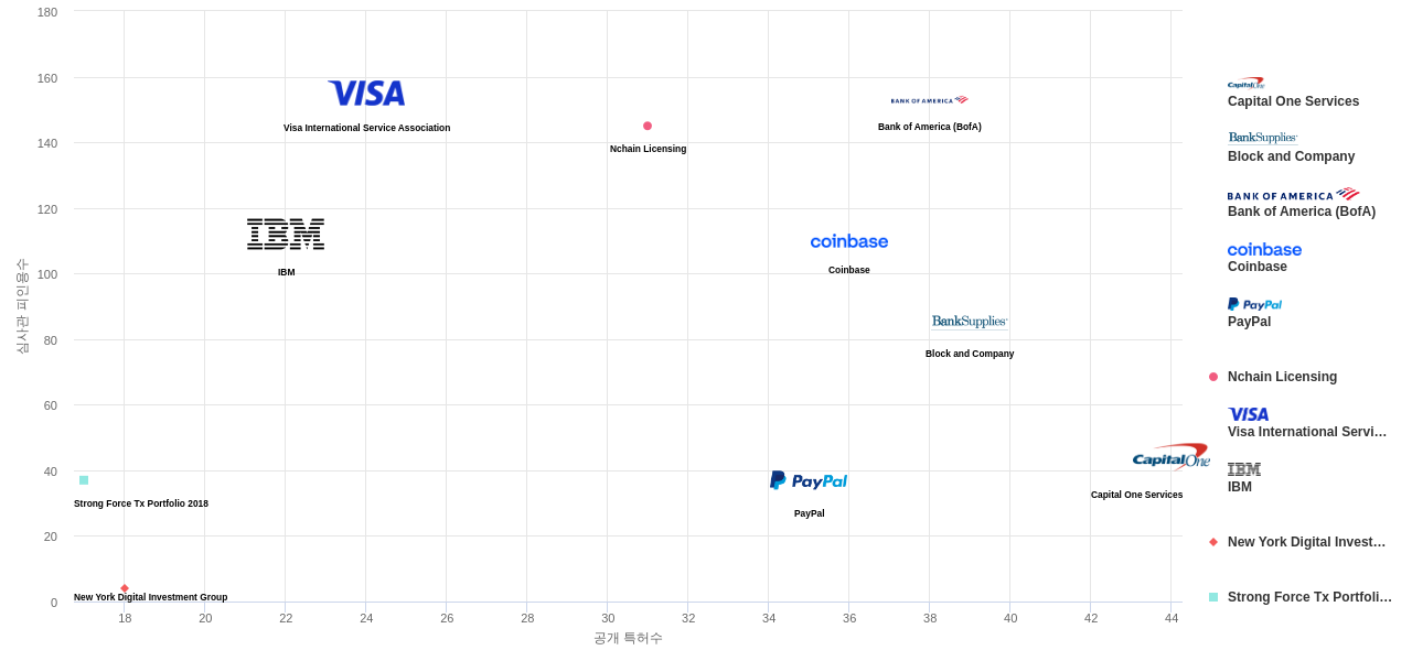 또한 Capital One Services는 공개 특허수(44건), 등록 특허수(25건), 공개 특허수 점유율(점유율_공개)(1.88%), New York Digital Investment Group은 집중률(94.7%), Coinbase는 매입 특허수(6건), Visa International Service Association은 심사관 피인용수(155회), 심사관 피인용수 점유율(점유율_FC-E)(3.07%), Nchain Licensing은 해외 특허 패밀리수(해외 Fam.)(538개)에서 1위 입니다. Block and Company는 공개 특허수(39건), 공개 특허수 점유율(점유율_공개)(1.66%), PayPal은 매입 특허수(2건), Bank of America (BofA)는 심사관 피인용수(153회), 심사관 피인용수 점유율(점유율_FC-E)(3.03%), Strong Force Tx Portfolio 2018은 해외 특허 패밀리수(해외 Fam.)(49개)에서 2위 입니다. IBM은(는) 심사관 피인용수(112회), 심사관 피인용수 점유율(점유율_FC-E)(2.22%)에서 4위 입니다.