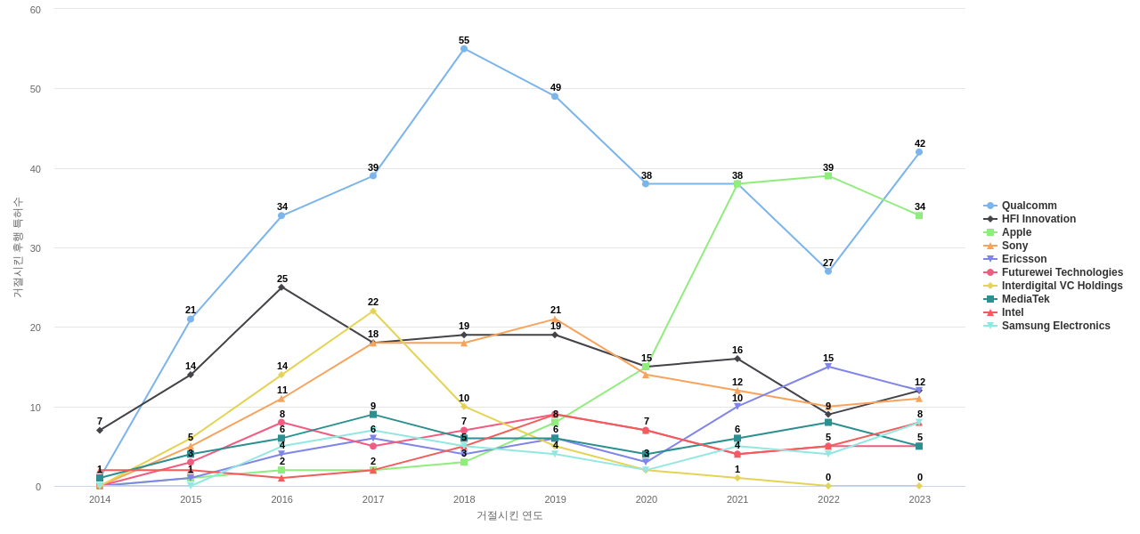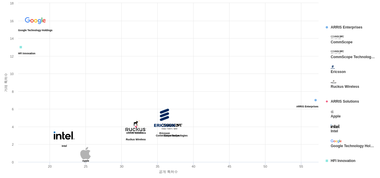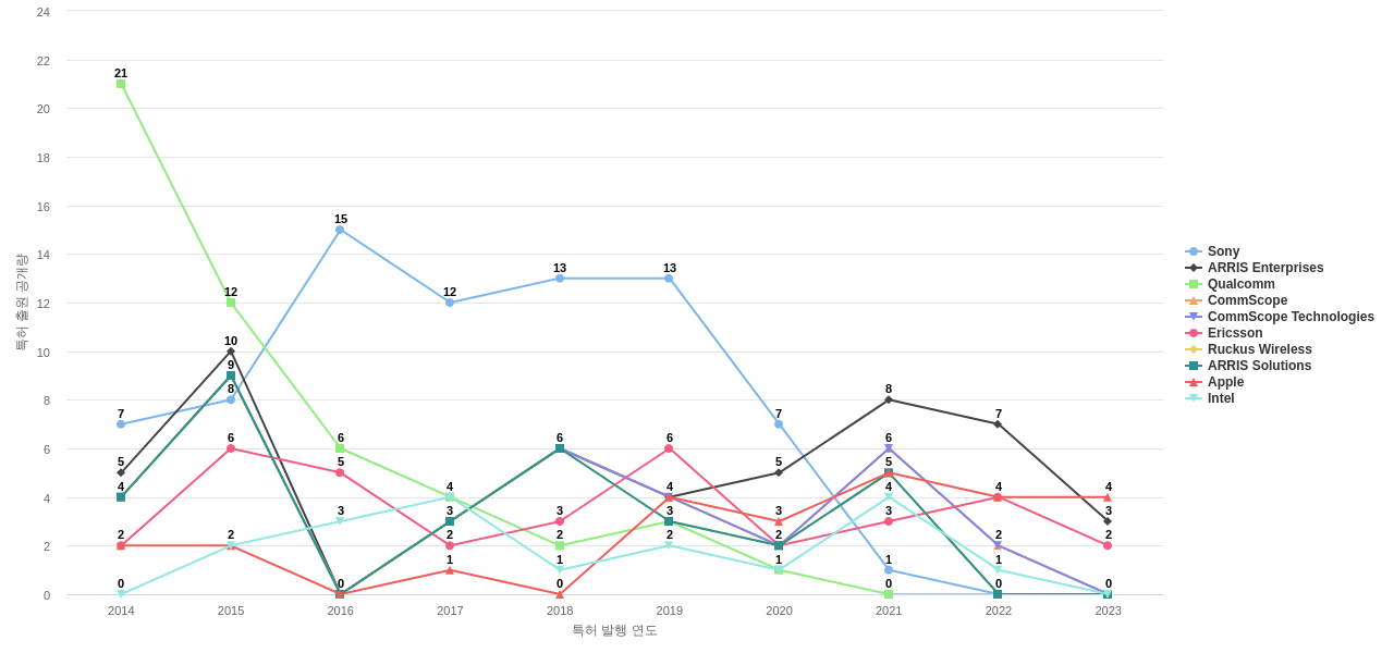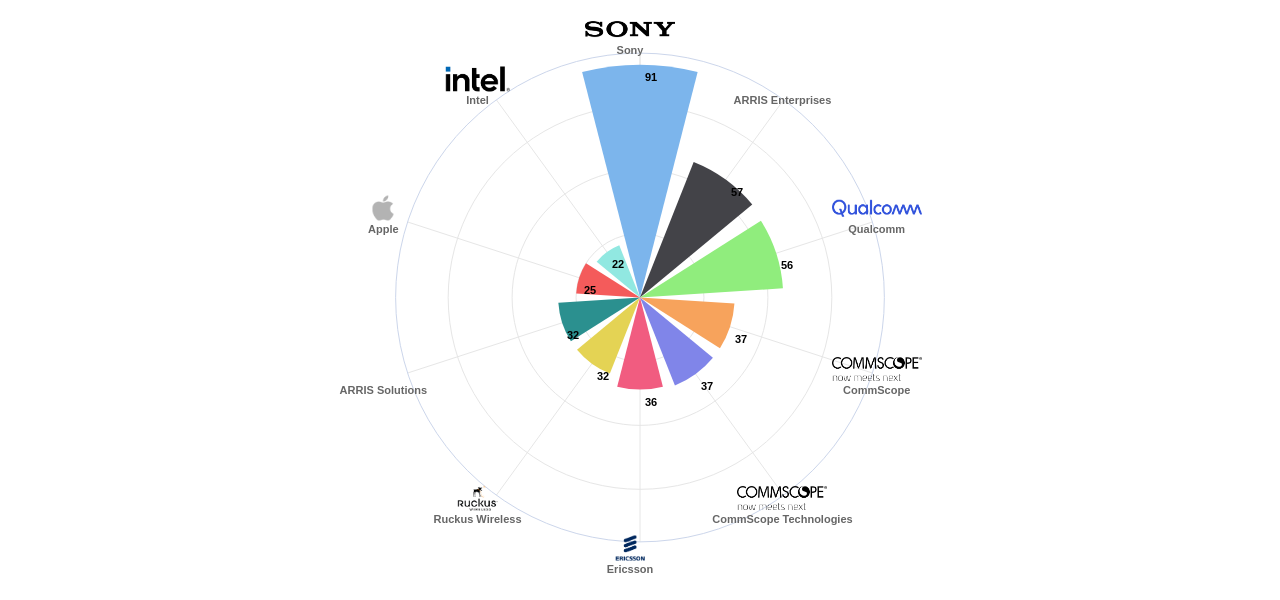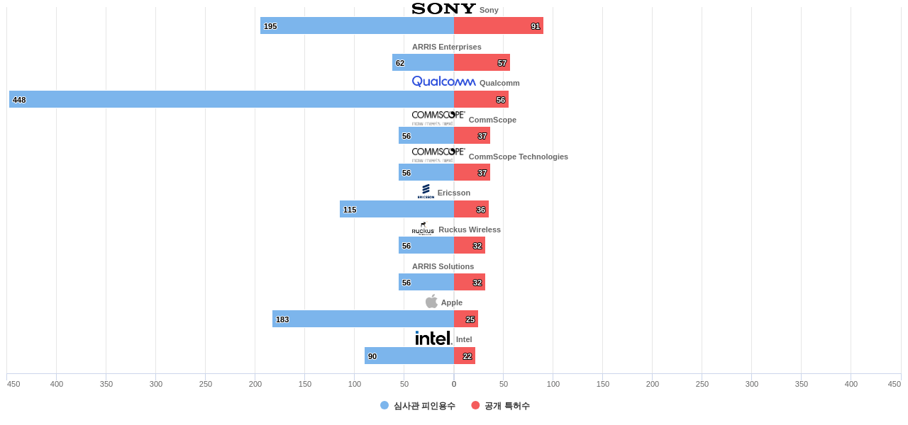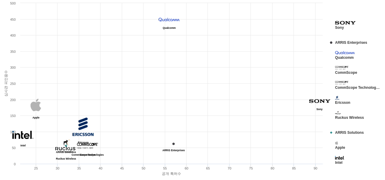 이 분야에서 보유 공개 특허가 많은 핵심 기업에는 1위 Sony, 2위 ARRIS Enterprises, 3위 Qualcomm 등이 있습니다.