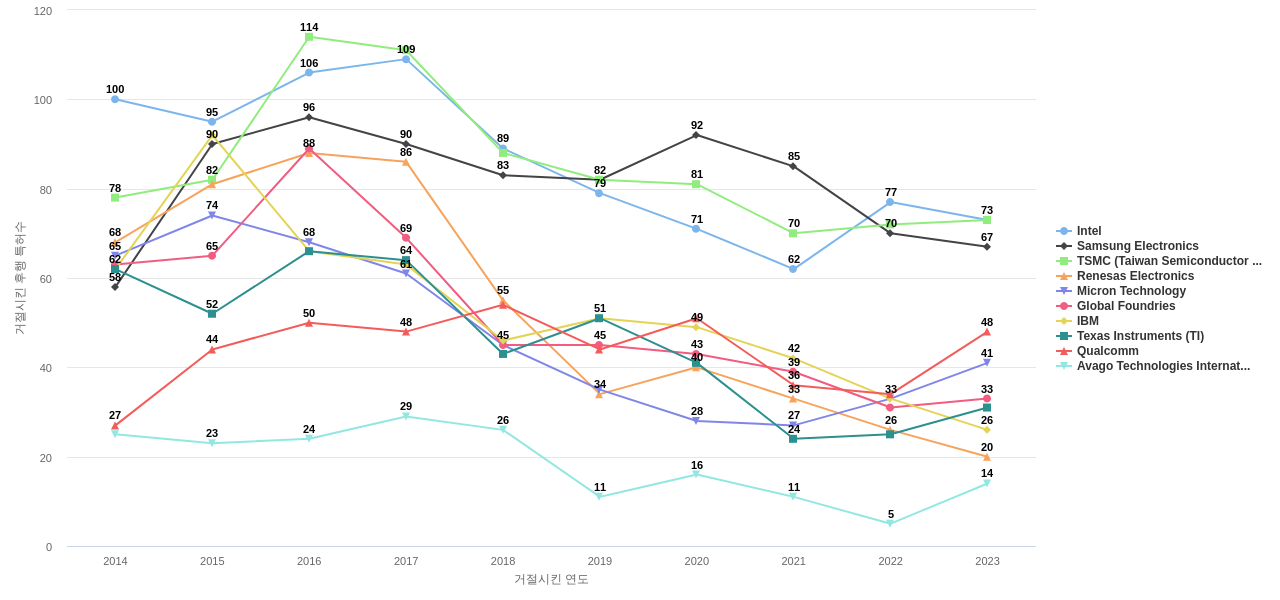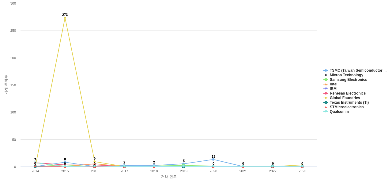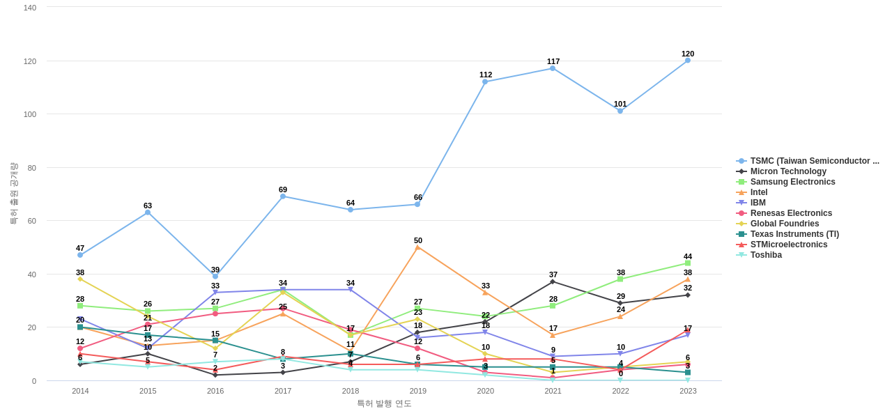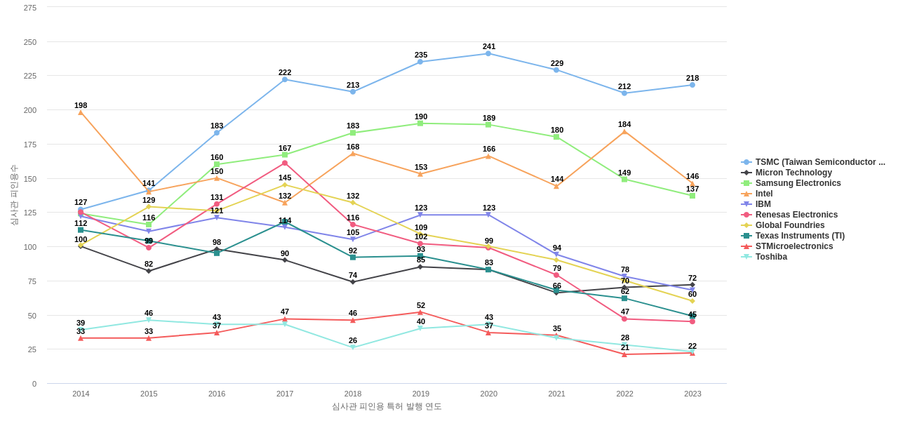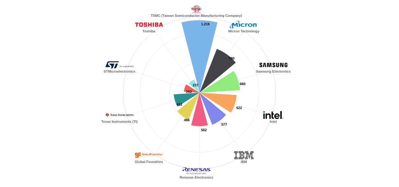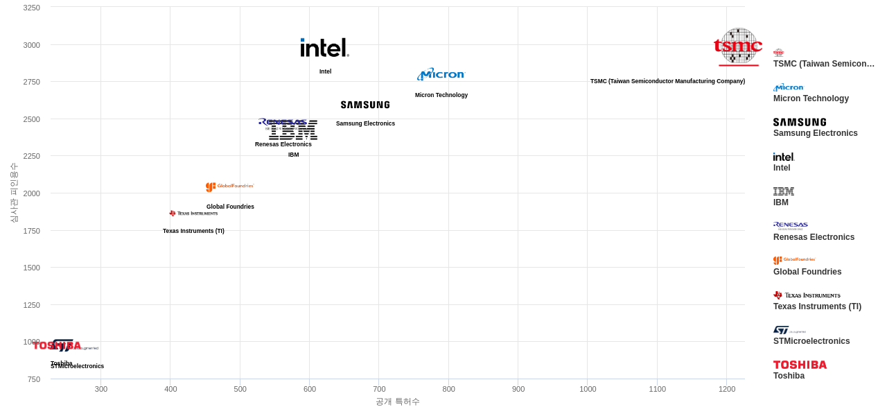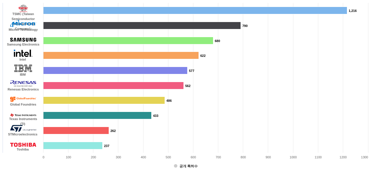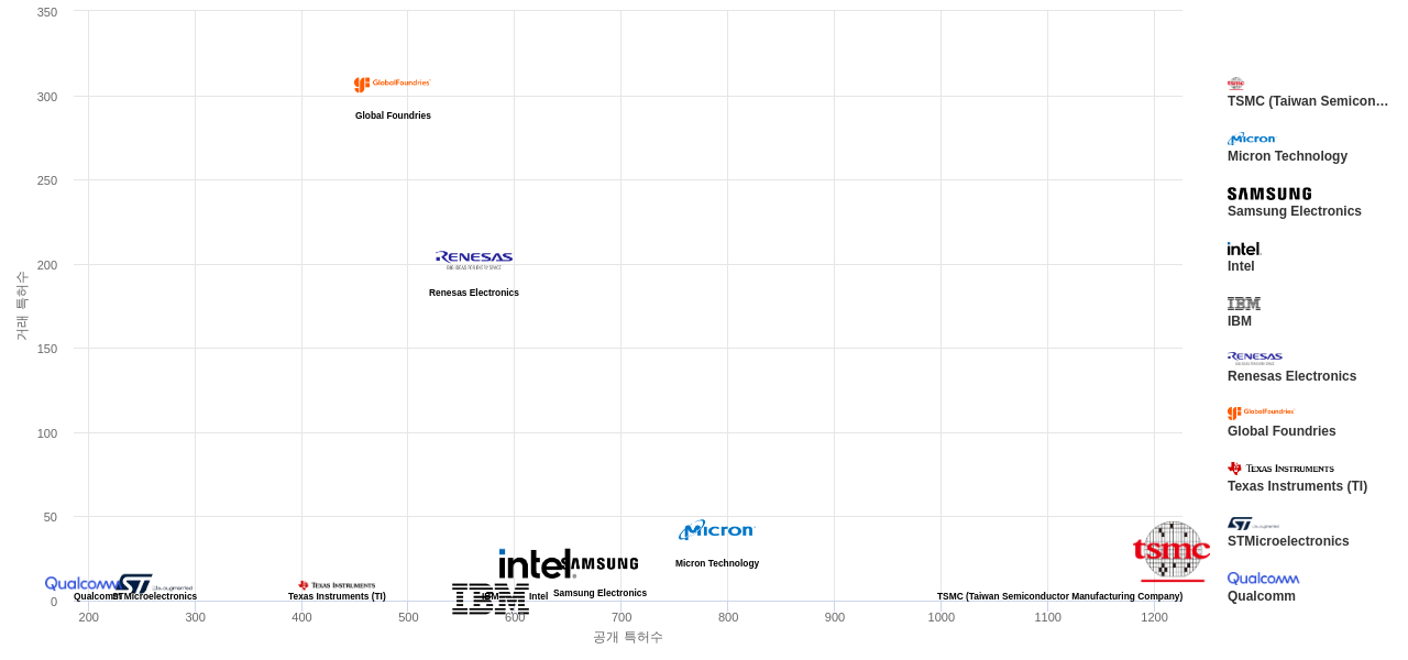 또한 TSMC (Taiwan Semiconductor Manufacturing Company)은(는) 공개 특허수(1,216건), 등록 특허수(1,027건), 공개 특허수 점유율(점유율_공개)(8.5%), 소송 특허수(3건), 심사관 피인용수(2,980회), 심사관 피인용수 점유율(점유율_FC-E)(6.05%), Renesas Electronics는 집중률(2.79%), Global Foundries는 매입 특허수(306건), Samsung Electronics는 심판 특허수(1건), 해외 특허 패밀리수(해외 Fam.)(1,317개)에서 1위 입니다. Micron Technology는 공개 특허수(790건), 등록 특허수(740건), 공개 특허수 점유율(점유율_공개)(5.52%), Intel은 심사관 피인용수(2,978회), 심사관 피인용수 점유율(점유율_FC-E)(6.05%)에서 2위 입니다. IBM은(는) 공개 특허수(577건), 등록 특허수(511건), 공개 특허수 점유율(점유율_공개)(4.03%), STMicroelectronics는 집중률(1.46%)에서 5위 입니다.