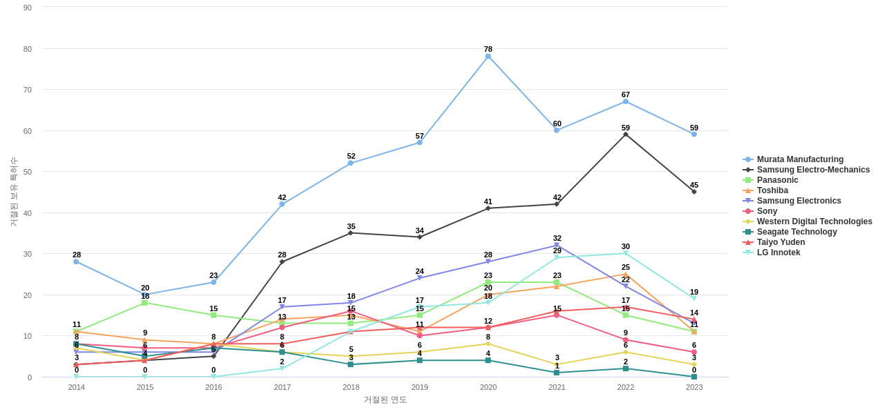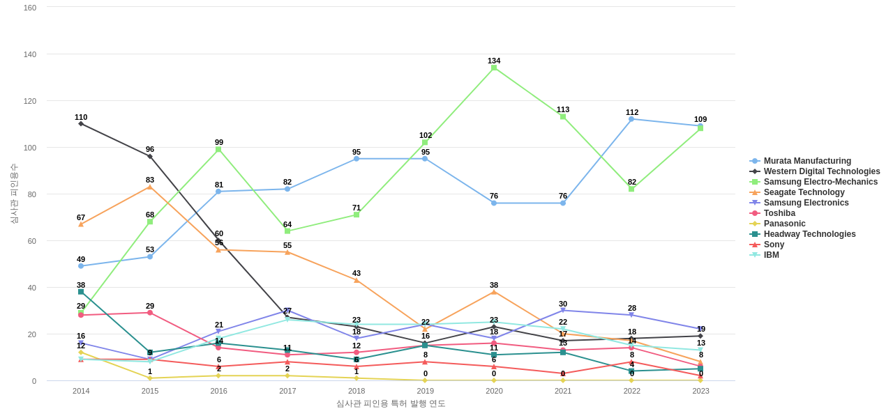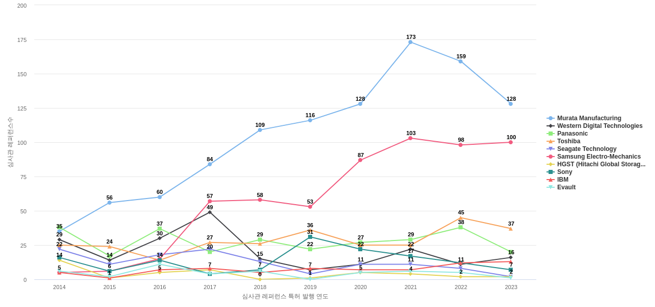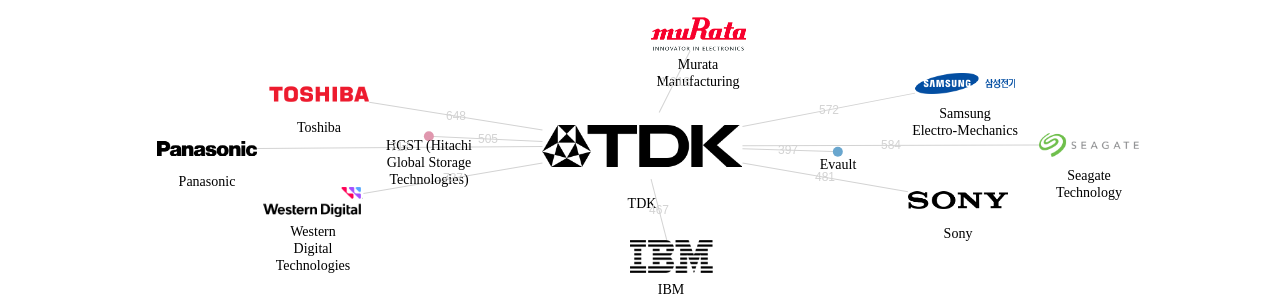 이 기업 보유 선행 특허가 받은 심사관 피인용수가 많은 관련 기업에는 1위 Murata Manufacturing(1,297회), 2위 Western Digital Technologies(1,211회), 3위 Samsung Electro-Mechanics(1,047회) 등이 있습니다.