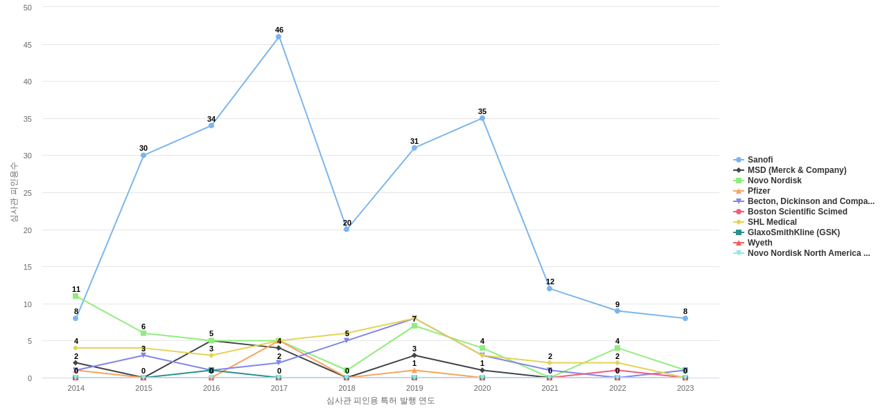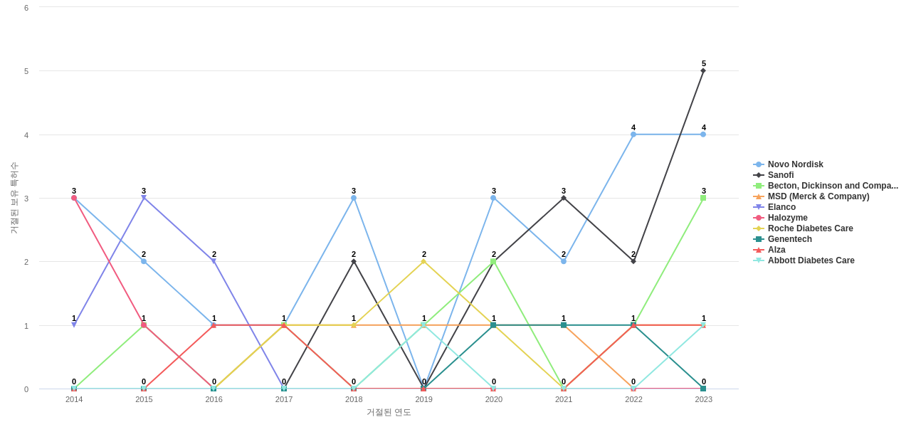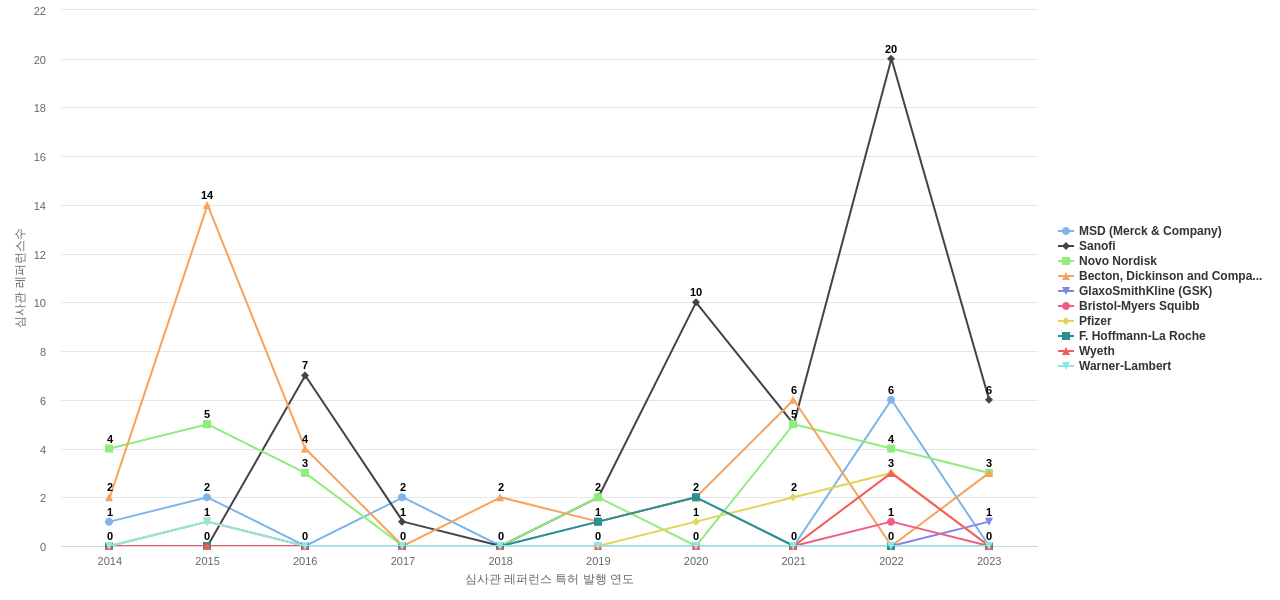 이 기업 보유 선행 특허가 받은 심사관 피인용수가 많은 관련 기업에는 1위 Sanofi(311회), 2위 MSD (Merck & Company)(87회), 3위 Novo Nordisk(83회) 등이 있습니다.