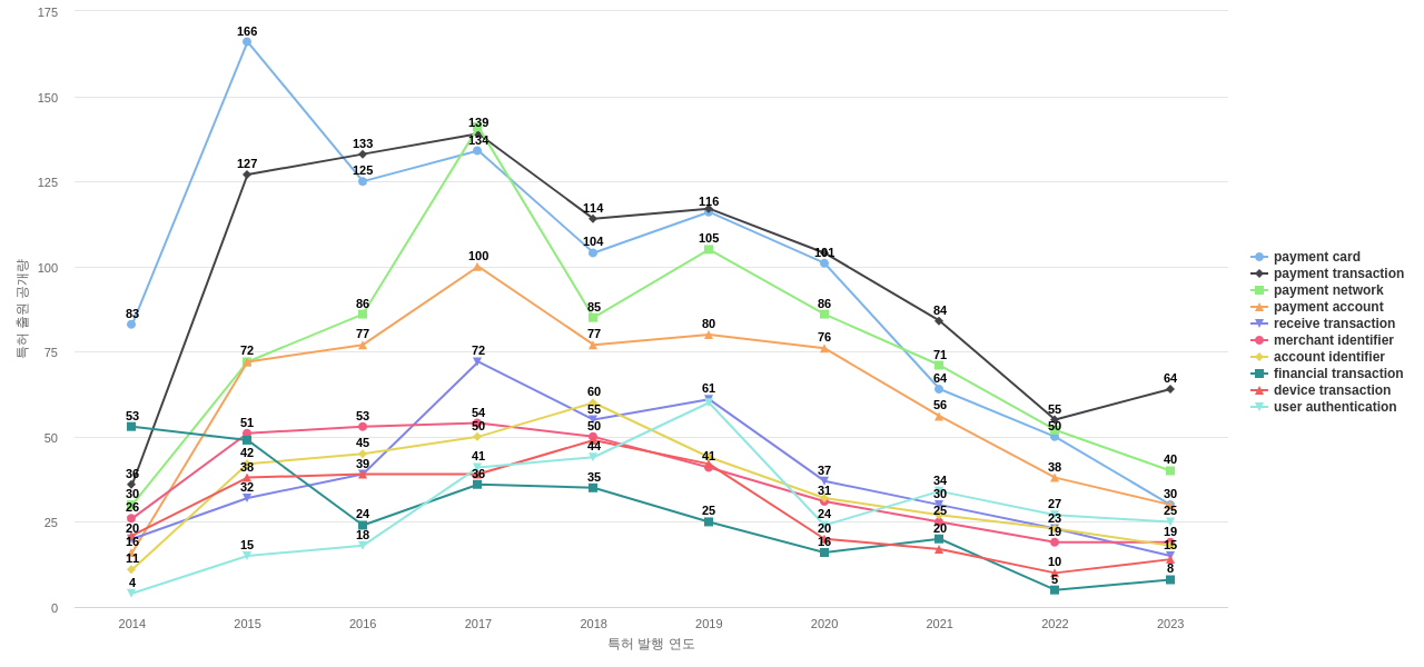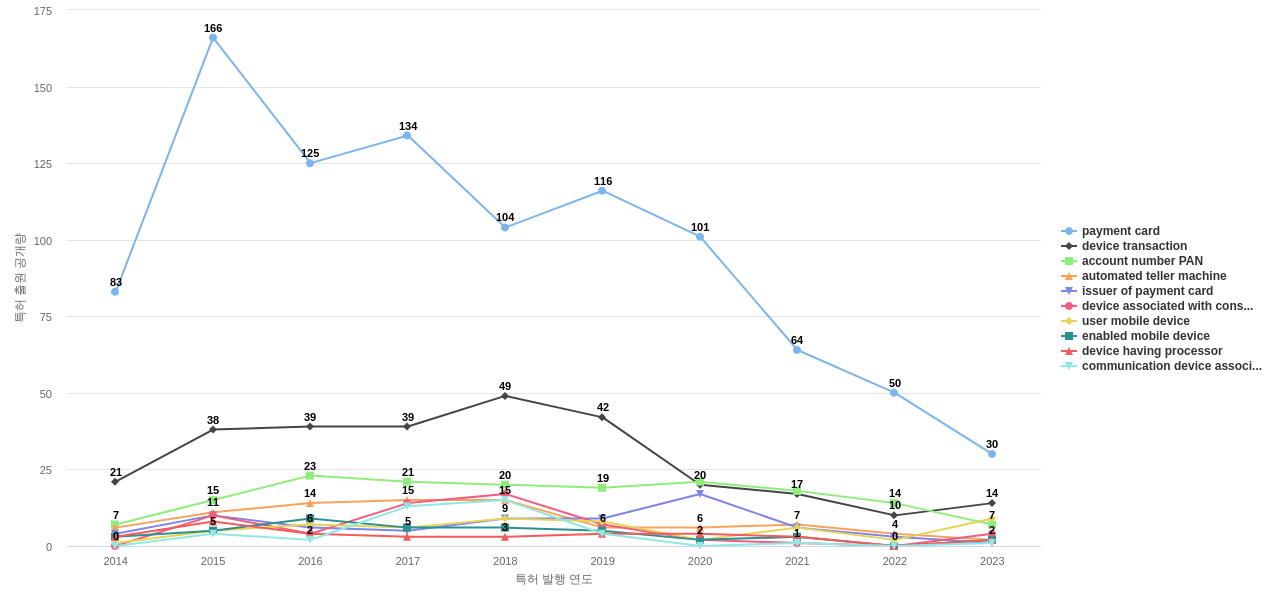 payment card의 공개 특허수는 1,179건입니다. payment card의 공개 특허수는 11년 이전부터 발생하기 시작하여 2015년에 166건의 최고값을 보입니다. 그리고, 이 값은 이번 연도인 2024년에는 18건, 1년 전인 2023년에는 30건, 2년 전인 2022년에는 50건을 보입니다.