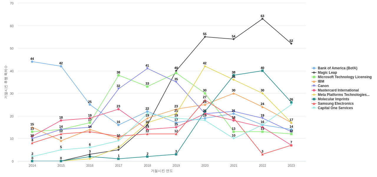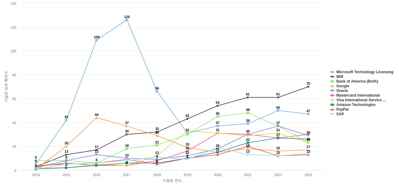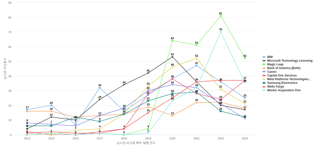Microsoft Technology Licensing의 심사관 레퍼런스수는 650회입니다. Microsoft Technology Licensing의 심사관 레퍼런스수는 11년 이전부터 발생하기 시작하여 2019년에 141회의 최고값을 보입니다. 그리고, 이 값은 이번 연도인 2024년에는 58회, 1년 전인 2023년에는 81회, 2년 전인 2022년에는 71회를 보입니다.