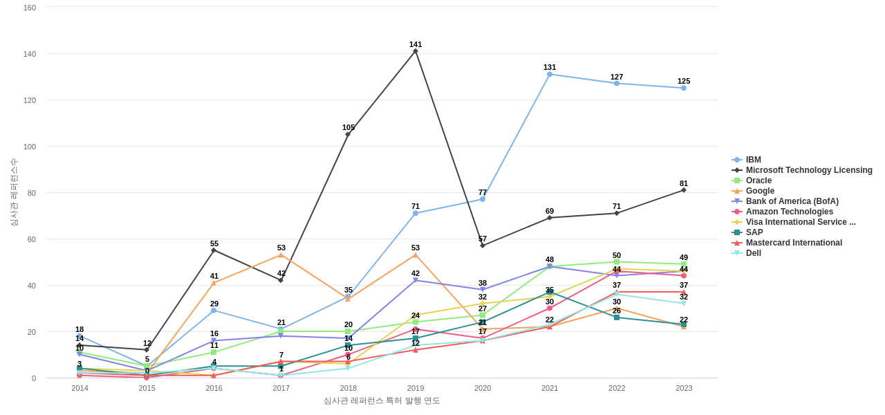 IBM의 심사관 레퍼런스수는 830회입니다. IBM의 심사관 레퍼런스수는 11년 이전부터 발생하기 시작하여 2021년에 131회의 최고값을 보입니다. 그리고, 이 값은 이번 연도인 2024년에는 108회, 1년 전인 2023년에는 125회, 2년 전인 2022년에는 127회를 보입니다.