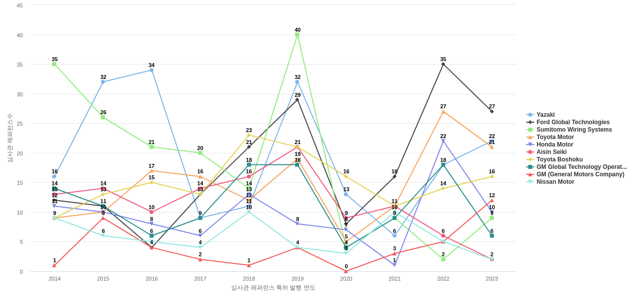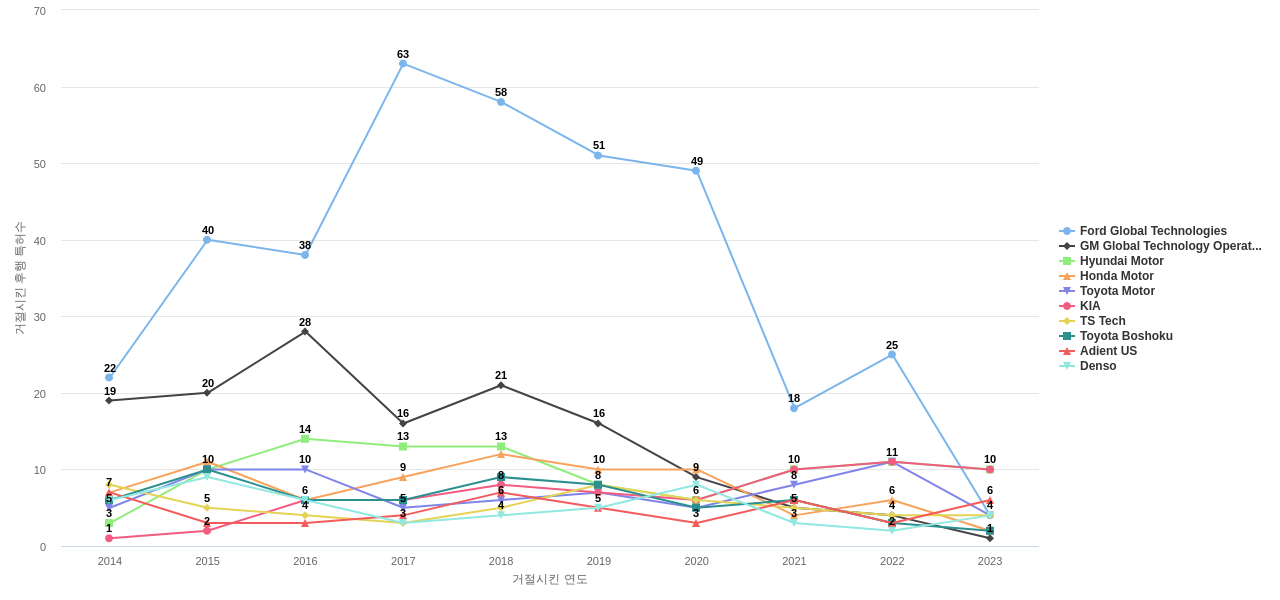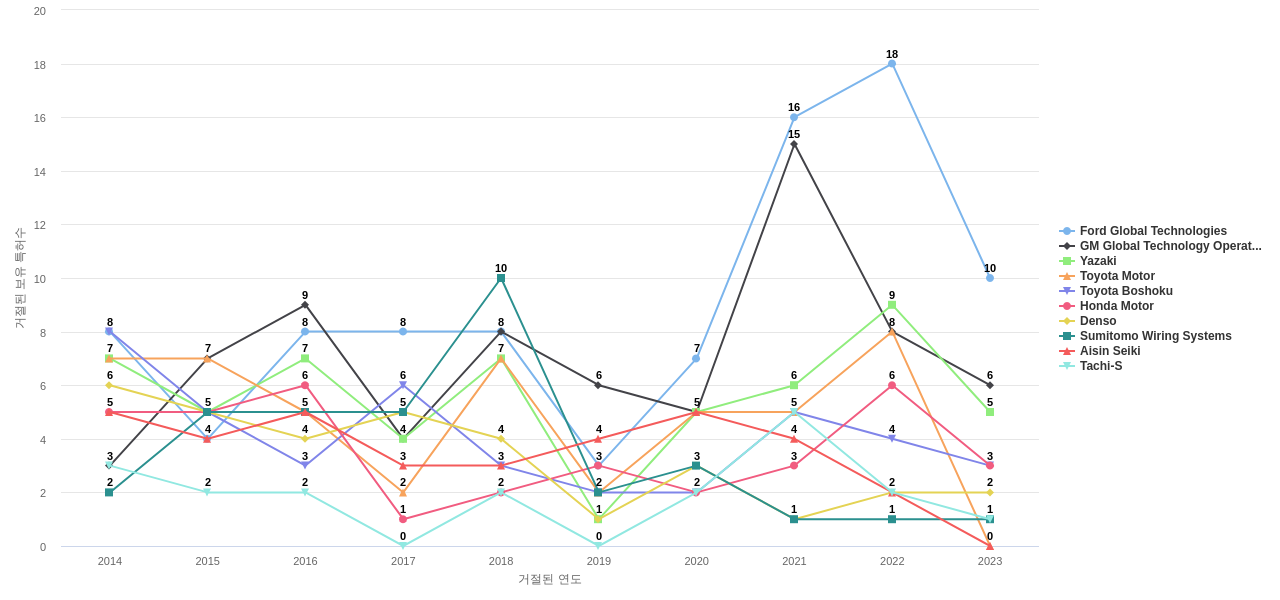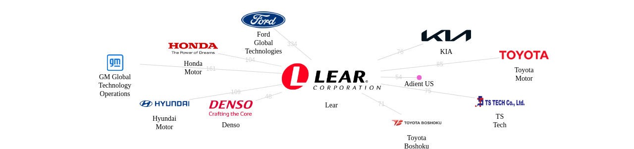 이 기업 보유 선행 특허가 받은 심사관 피인용수가 많은 관련 기업에는 1위 Ford Global Technologies(757회), 2위 Honda Motor(393회), 3위 GM Global Technology Operations(376회) 등이 있습니다.