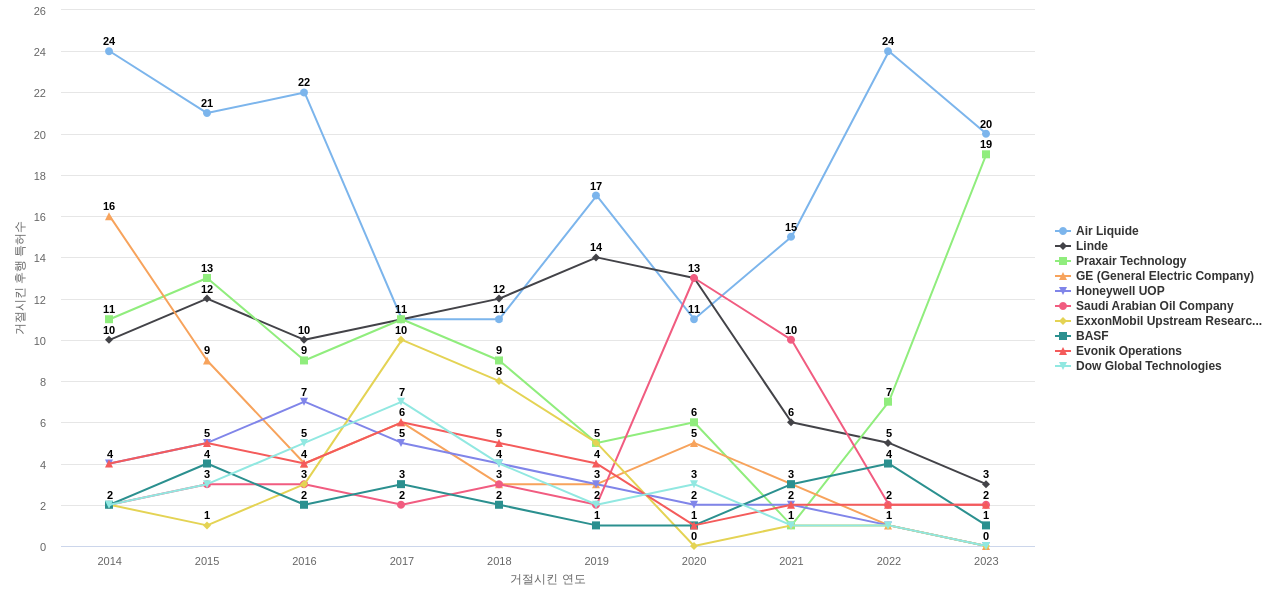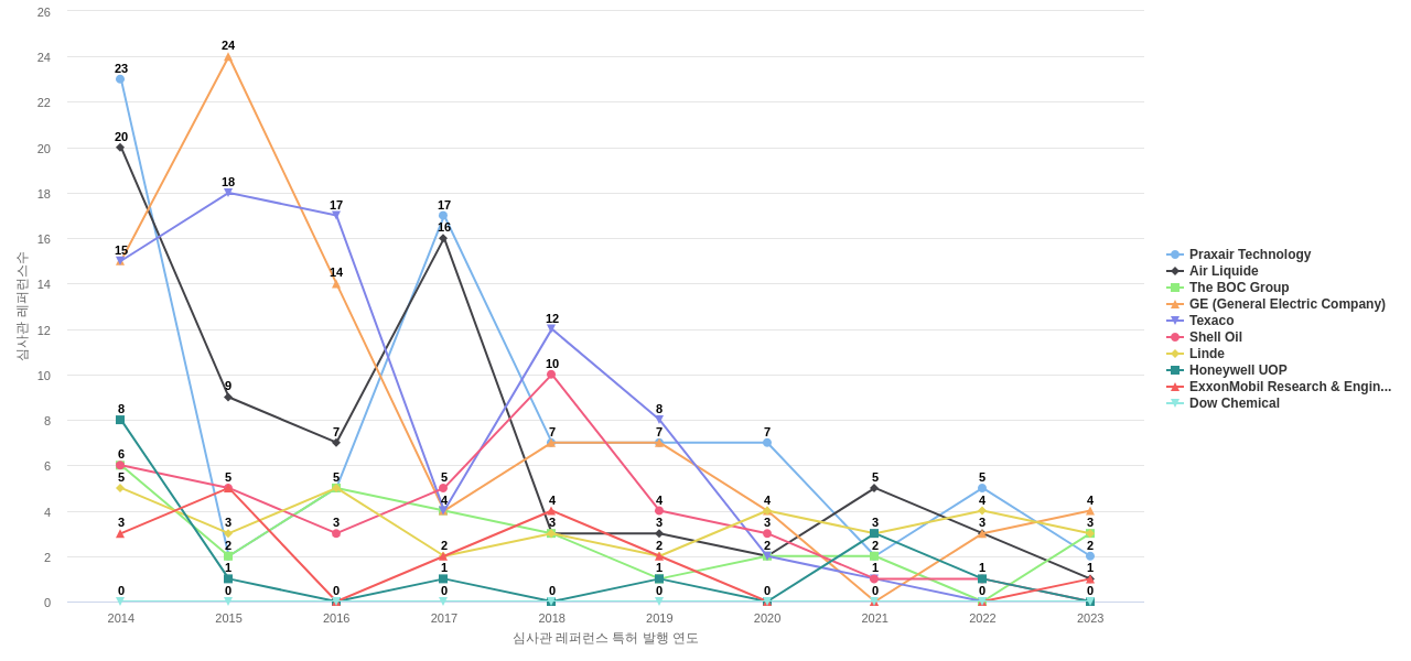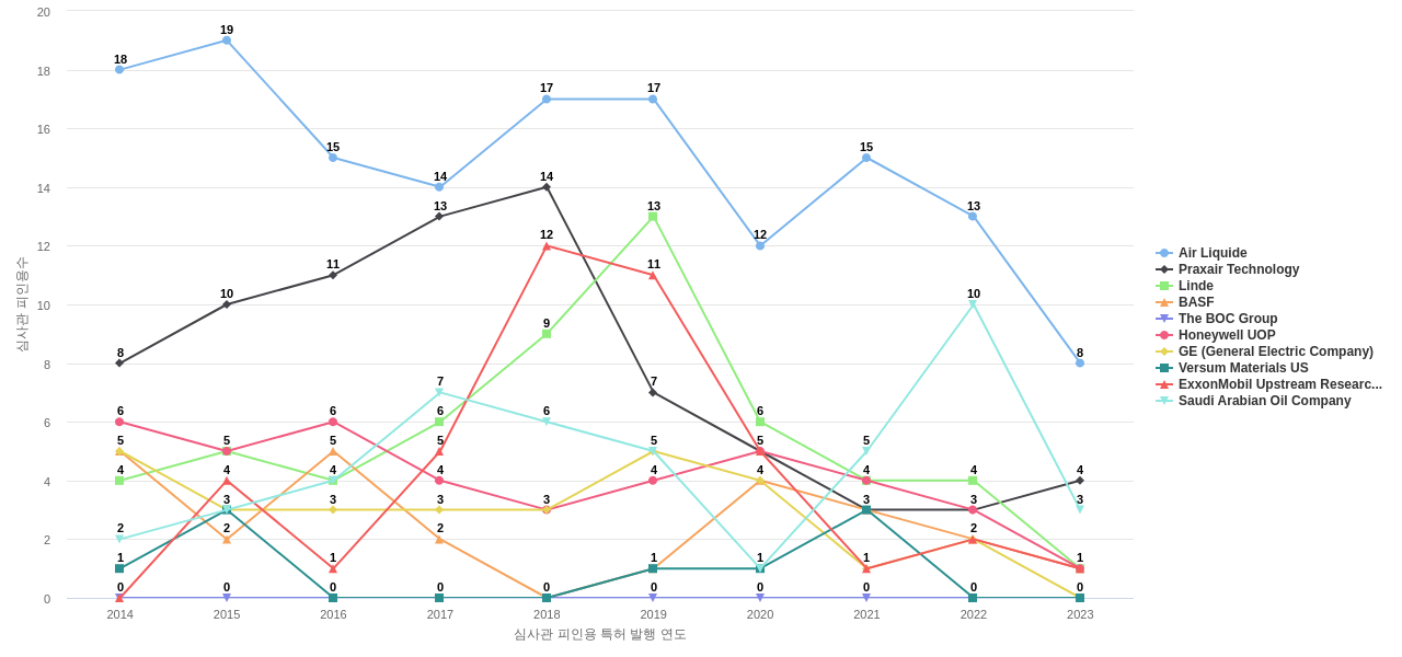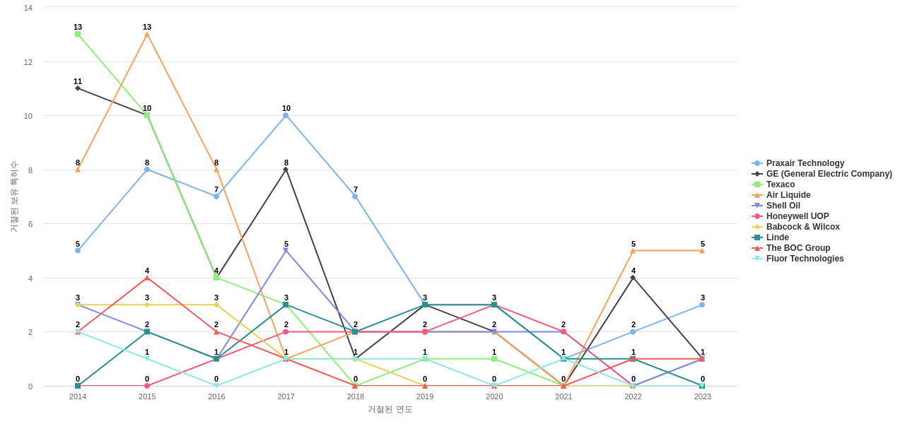 이 기업 보유 선행 특허가 받은 심사관 피인용수가 많은 관련 기업에는 1위 Air Liquide(412회), 2위 Praxair Technology(339회), 3위 Linde(112회) 등이 있습니다.