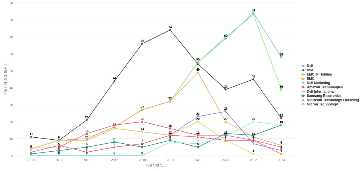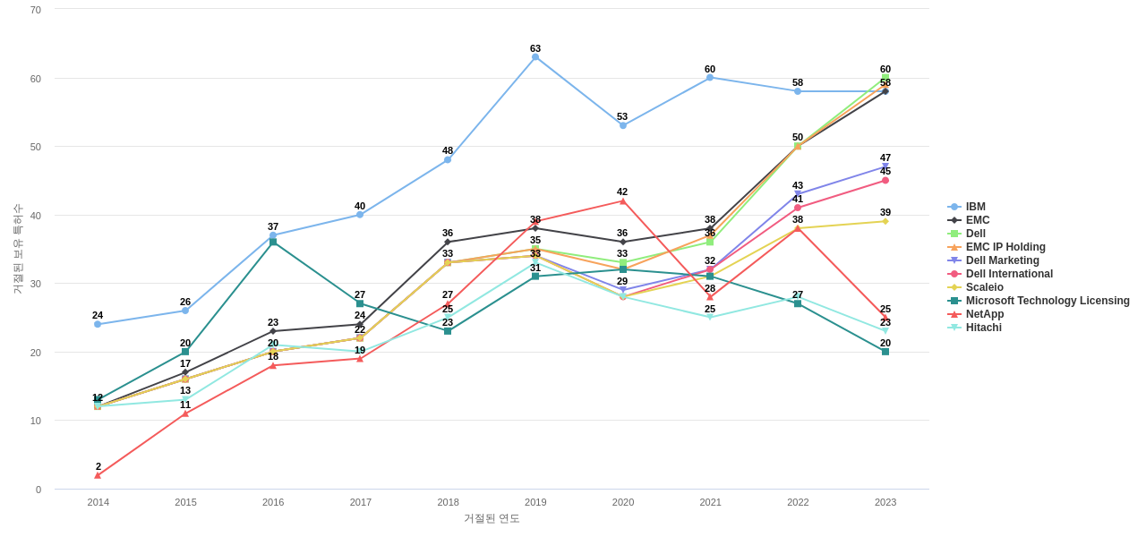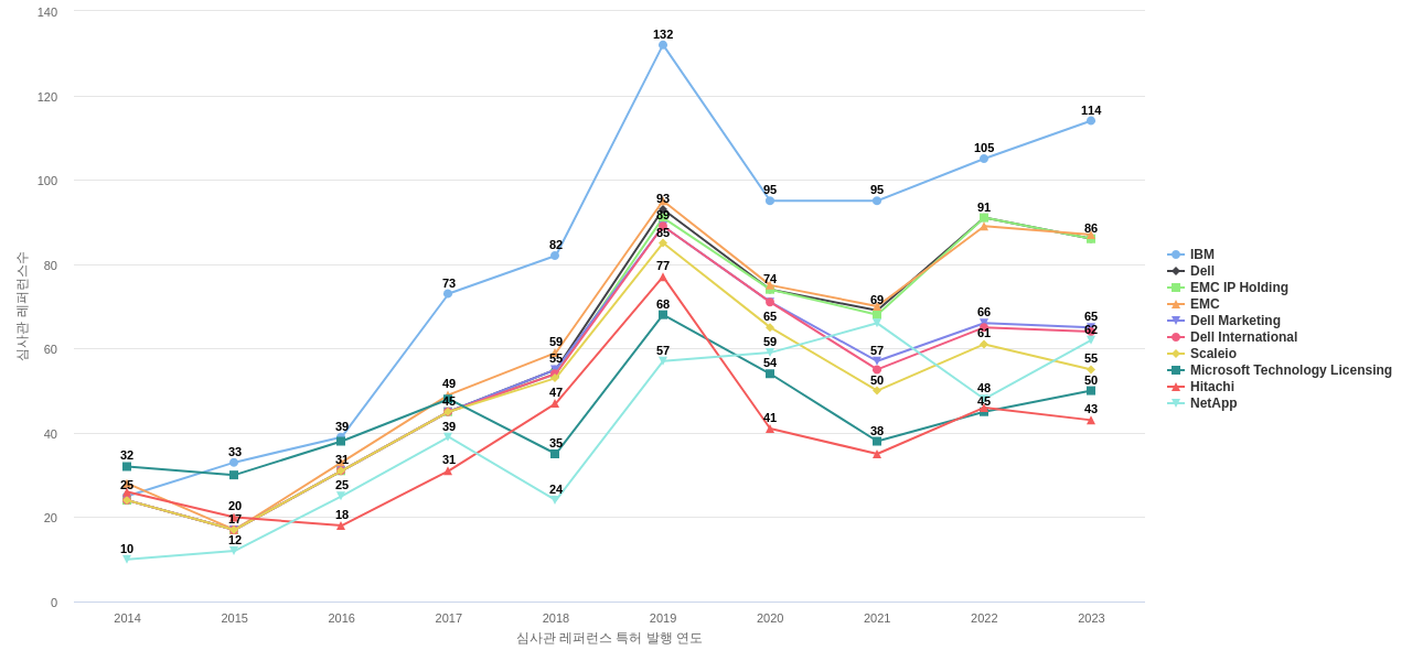 이 기업 보유 후행 특허가 참조하는 심사관 레퍼런스수가 많은 관련 기업에는 1위 IBM(717회), 2위 Dell(543회), 3위 EMC IP Holding(538회) 등이 있습니다.