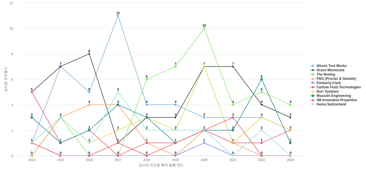 이 기업 보유 선행 특허가 받은 심사관 피인용수가 많은 관련 기업에는 1위 Illinois Tool Works(111회), 2위 Graco Minnesota(74회), 3위 The Boeing(54회) 등이 있습니다.
