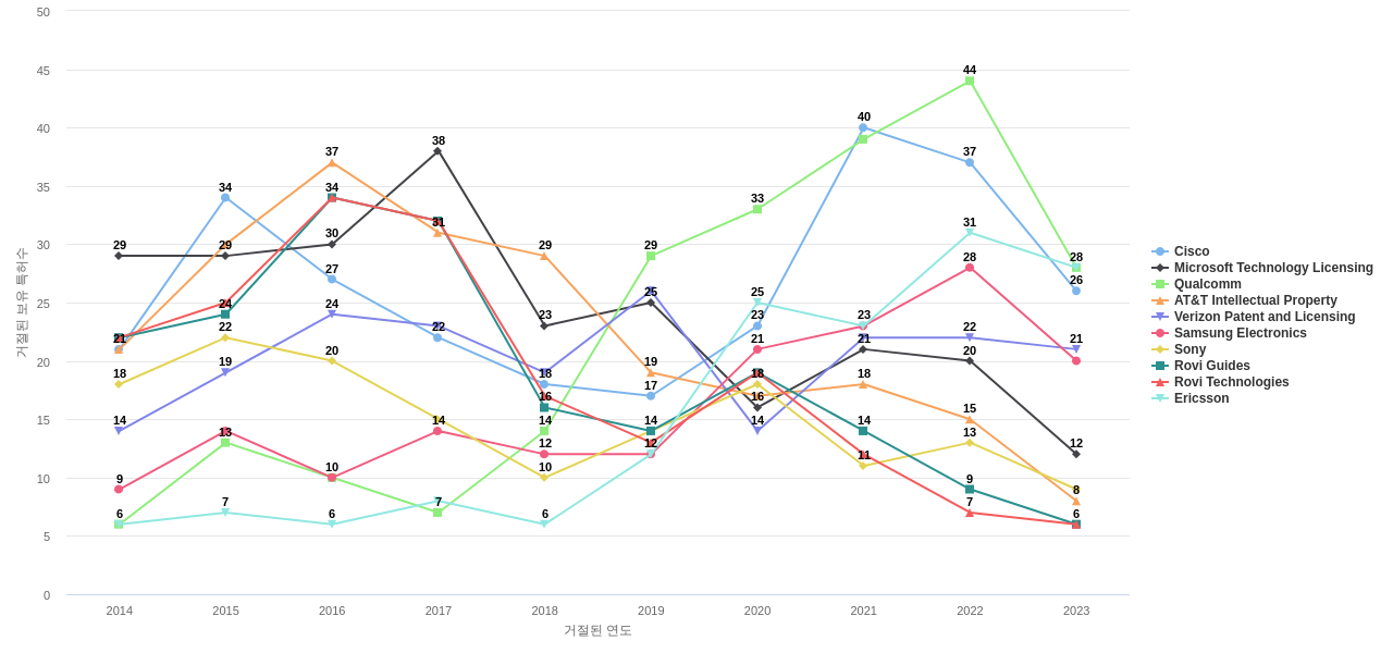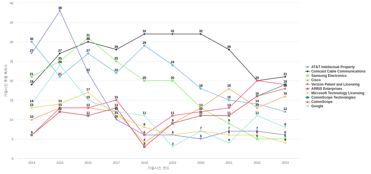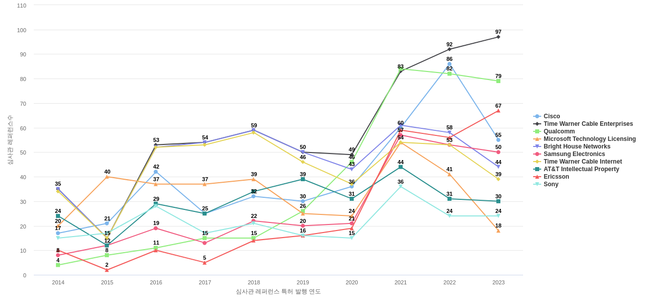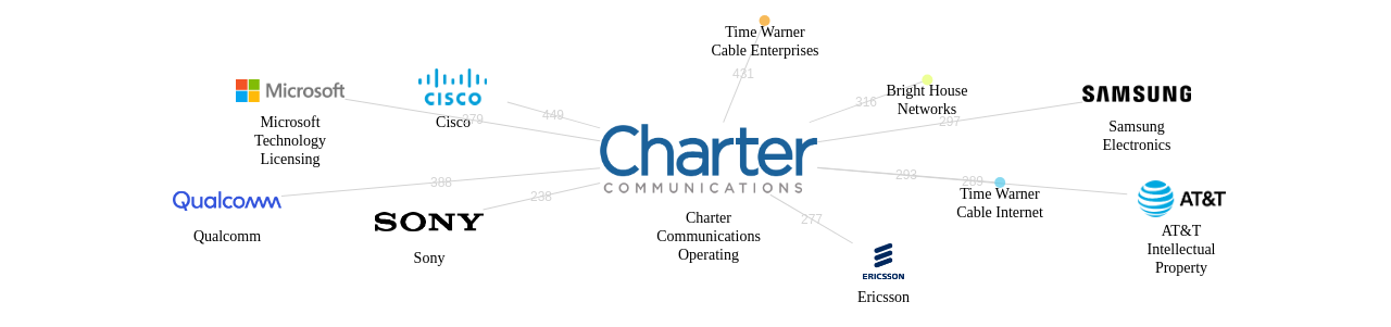 이 기업 보유 선행 특허가 받은 심사관 피인용수가 많은 관련 기업에는 1위 Time Warner Cable Enterprises(431회), 2위 AT&T Intellectual Property(314회), 3위 Bright House Networks(269회) 등이 있습니다.