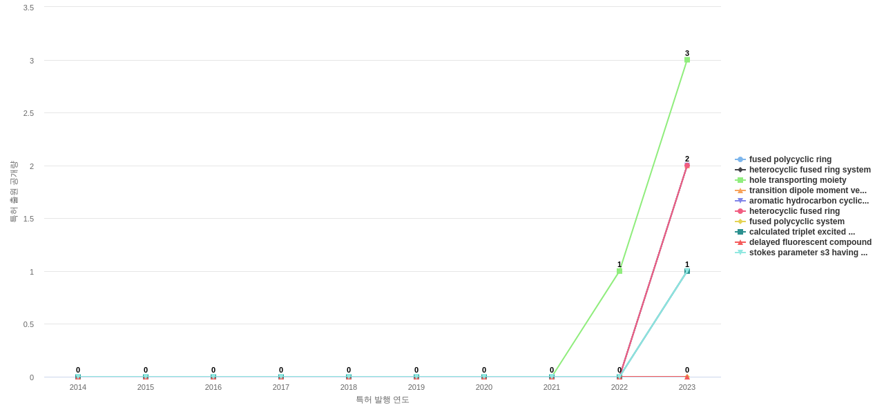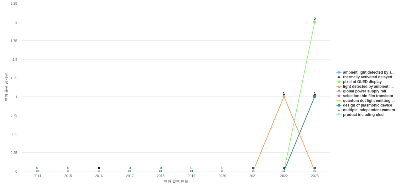 1) [기술 기획 조직]/[IP 조직] Universal Display의 특허에 포함된 신규 등장 키워드나 급성장하고 있는 키워드(제품-부품, 소재-물질, 기능-작용, 컨셉 등)를 i) 파악하고, ii) 체계적으로 테크 센싱을 수행하며, iii) 그 결과를 필요 조직에 전파해야 하지 않을까요? 특히, 고객, 주요 기업, 경쟁사, 밸류 체인이나 공급망 구성 기업인 Universal Display라면 이러한 활동이 더욱 더 중요하지 않을까요?
