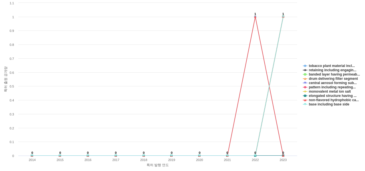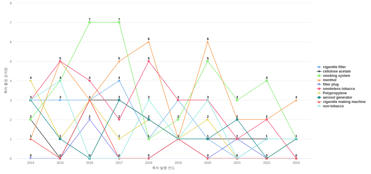 1) [기술 기획 조직]/[IP 조직] Philip Morris의 특허에 포함된 신규 등장 키워드나 급성장하고 있는 키워드(제품-부품, 소재-물질, 기능-작용, 컨셉 등)를 i) 파악하고, ii) 체계적으로 테크 센싱을 수행하며, iii) 그 결과를 필요 조직에 전파해야 하지 않을까요? 특히, 고객, 주요 기업, 경쟁사, 밸류 체인이나 공급망 구성 기업인 Philip Morris라면 이러한 활동이 더욱 더 중요하지 않을까요?