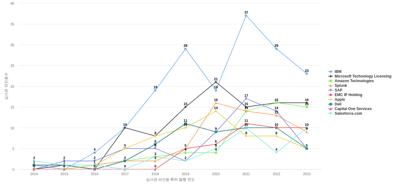 이 기업 보유 후행 특허가 참조하는 심사관 레퍼런스수가 많은 관련 기업에는 1위 IBM(609회), 2위 Microsoft Technology Licensing(604회), 3위 Google(282회) 등이 있습니다.