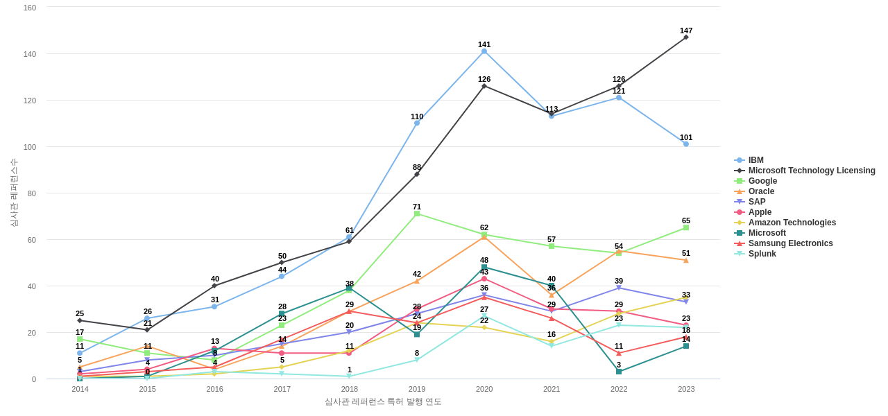 IBM의 심사관 레퍼런스수는 609회입니다. IBM의 심사관 레퍼런스수는 11년 이전부터 발생하기 시작하여 2020년에 141회의 최고값을 보입니다. 그리고, 이 값은 이번 연도인 2024년에는 89회, 1년 전인 2023년에는 101회, 2년 전인 2022년에는 121회를 보입니다.