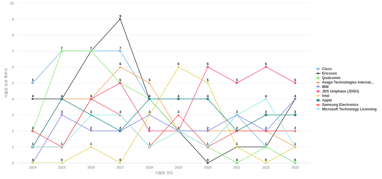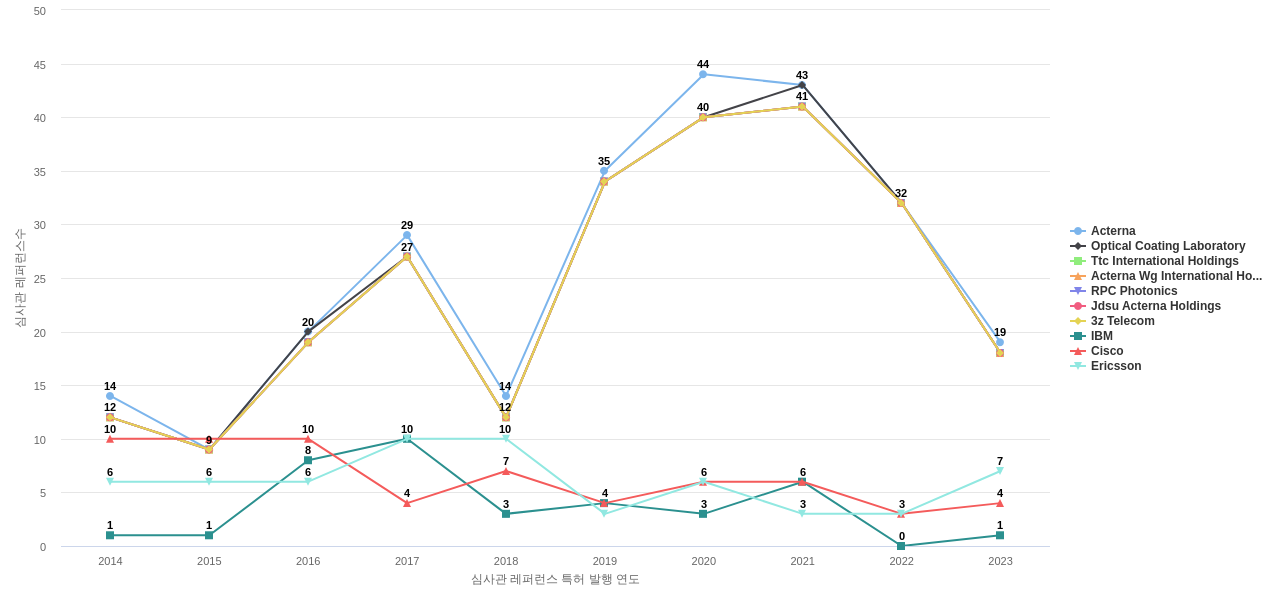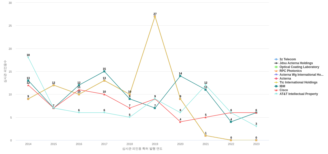 이 기업 보유 후행 특허가 참조하는 심사관 레퍼런스수가 많은 관련 기업에는 1위 Acterna(257회), 2위 Optical Coating Laboratory(244회), 3위 Ttc International Holdings(239회) 등이 있습니다.