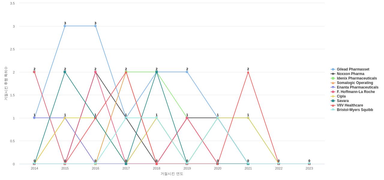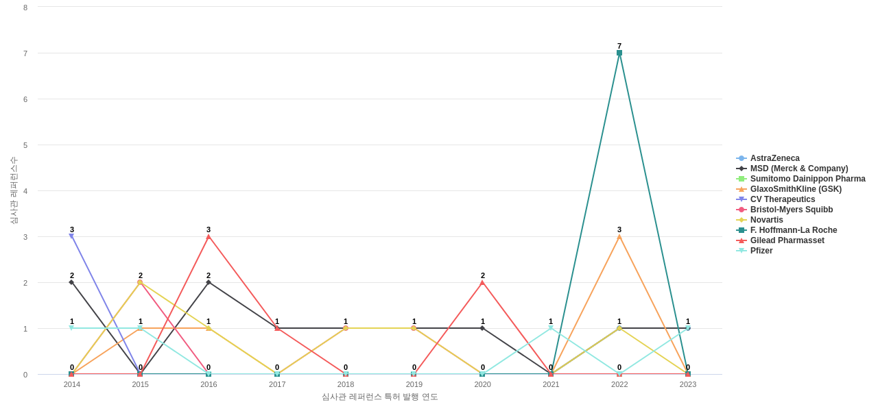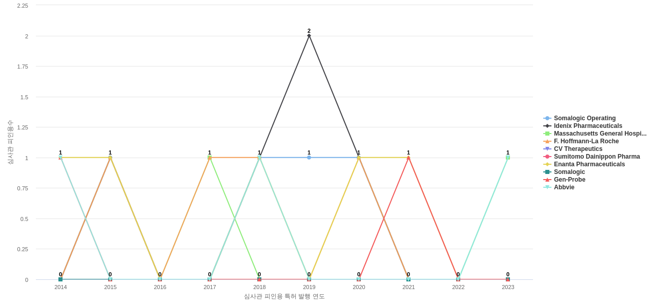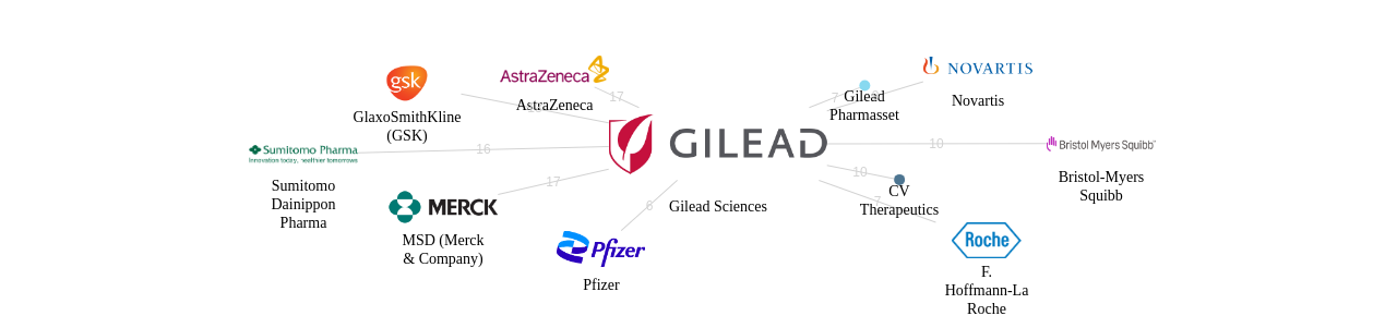 이 기업 보유 선행 특허가 받은 심사관 피인용수가 많은 관련 기업에는 1위 Somalogic Operating(12회), 2위 Idenix Pharmaceuticals(8회), 3위 Massachusetts General Hospital (MGH, Mass General)(8회) 등이 있습니다.