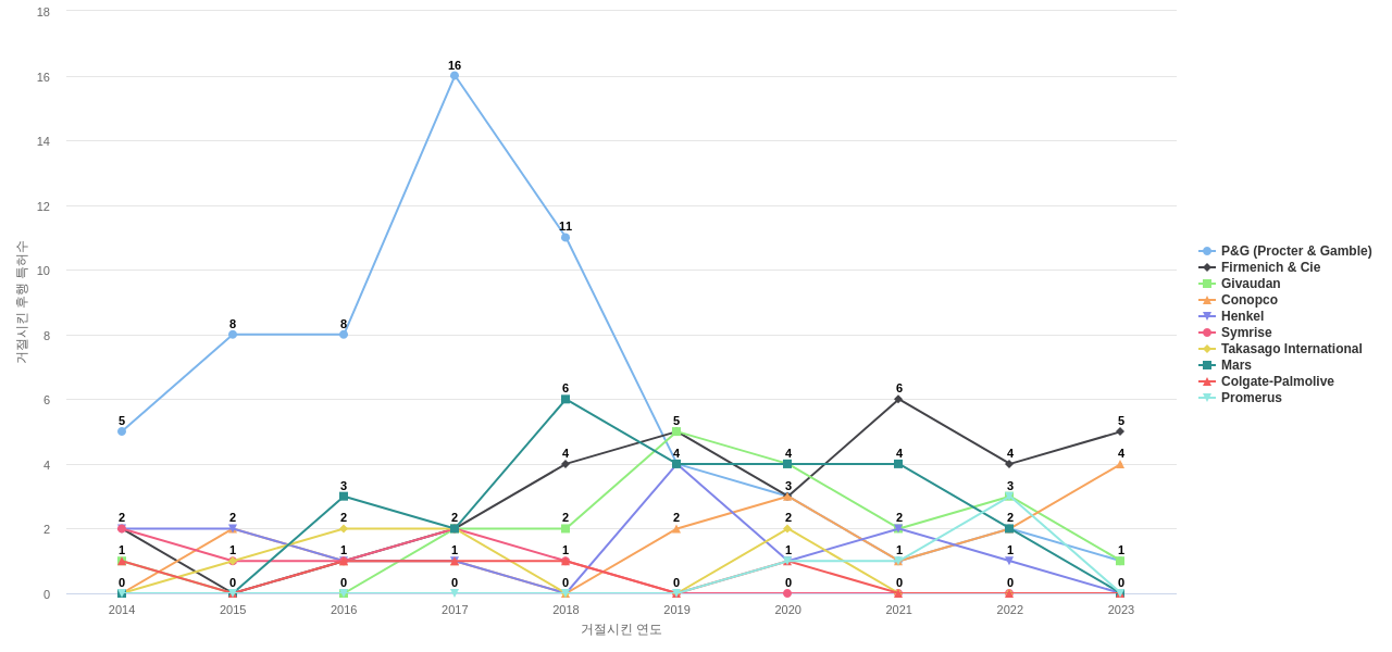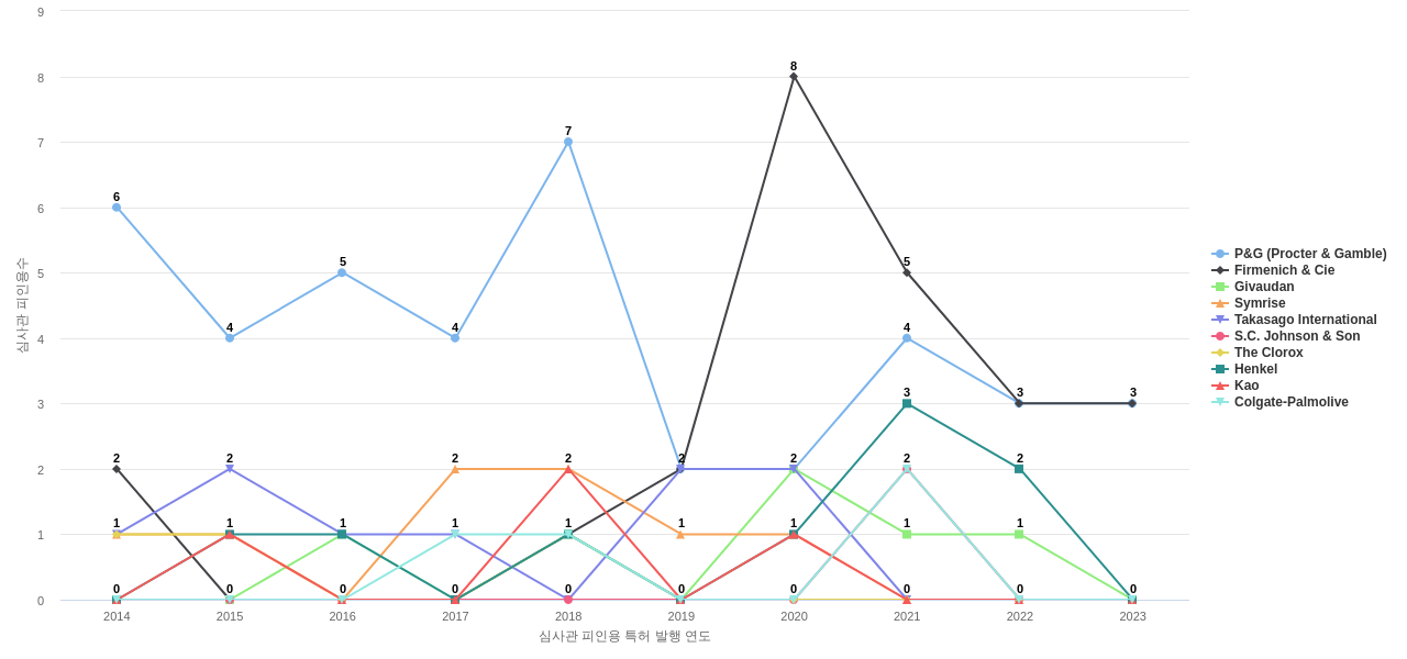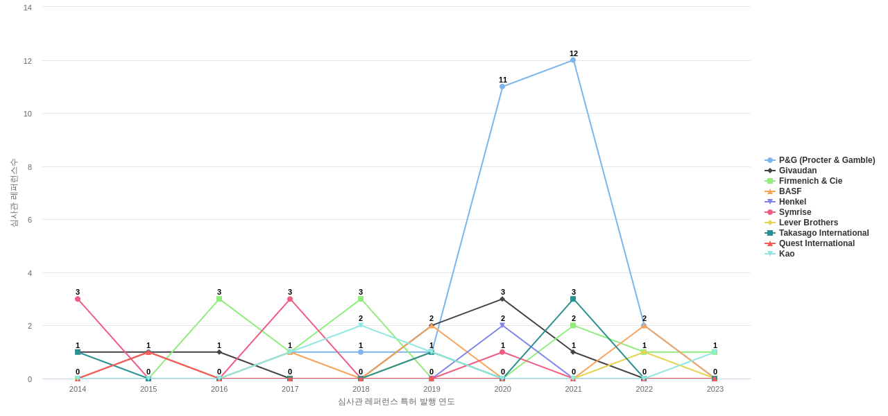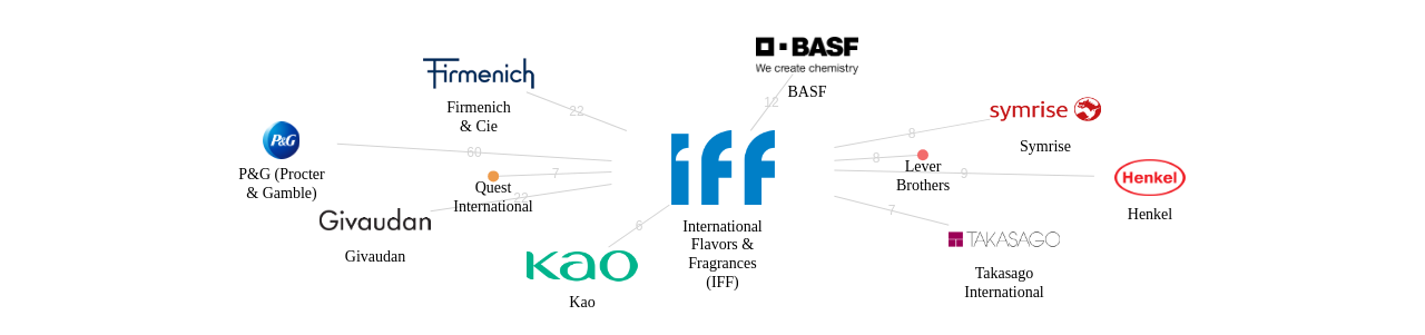 이 기업 보유 선행 특허가 받은 심사관 피인용수가 많은 관련 기업에는 1위 P&G (Procter & Gamble)(92회), 2위 Firmenich & Cie(56회), 3위 Givaudan(27회) 등이 있습니다.