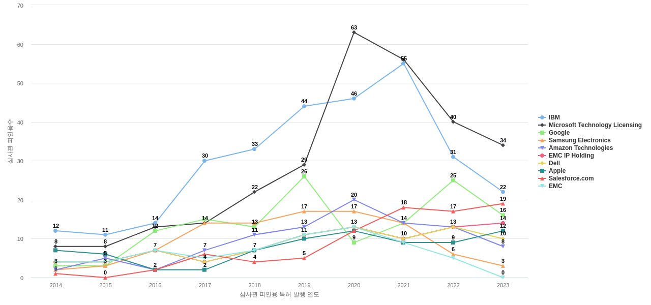 IBM의 심사관 레퍼런스수는 488회입니다. IBM의 심사관 레퍼런스수는 11년 이전부터 발생하기 시작하여 2019년에 80회의 최고값을 보입니다. 그리고, 이 값은 이번 연도인 2024년에는 37회, 1년 전인 2023년에는 33회, 2년 전인 2022년에는 73회를 보입니다.