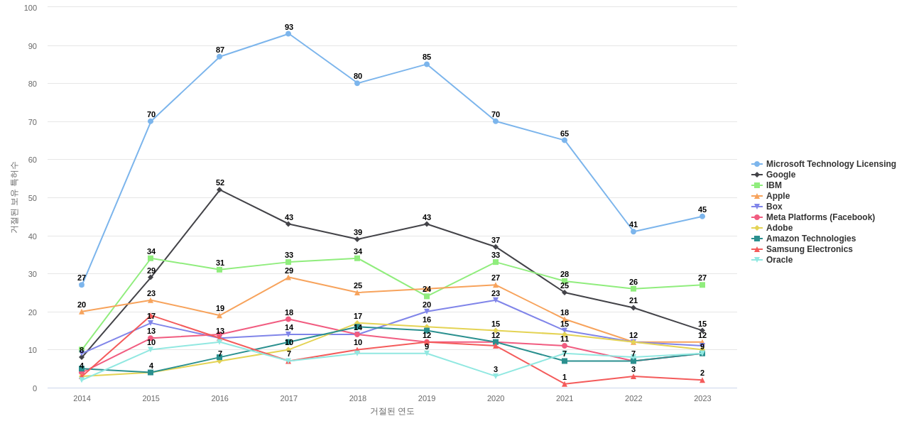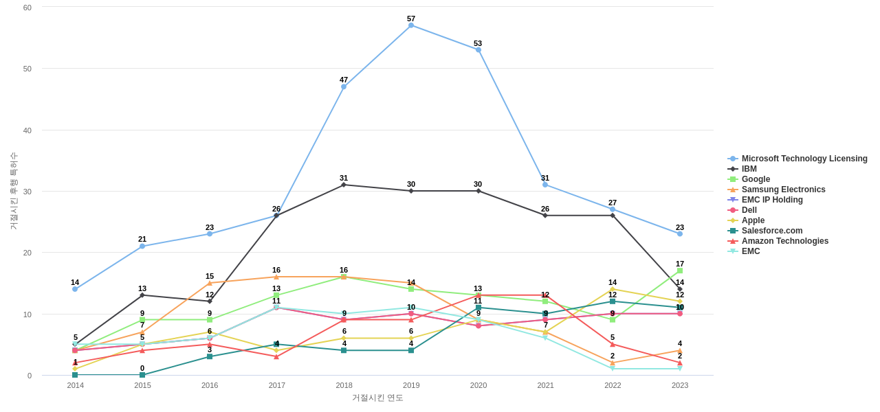 Microsoft Technology Licensing의 심사관 레퍼런스수는 842회입니다. Microsoft Technology Licensing의 심사관 레퍼런스수는 11년 이전부터 발생하기 시작하여 2021년에 155회의 최고값을 보입니다. 그리고, 이 값은 이번 연도인 2024년에는 82회, 1년 전인 2023년에는 63회, 2년 전인 2022년에는 134회를 보입니다.