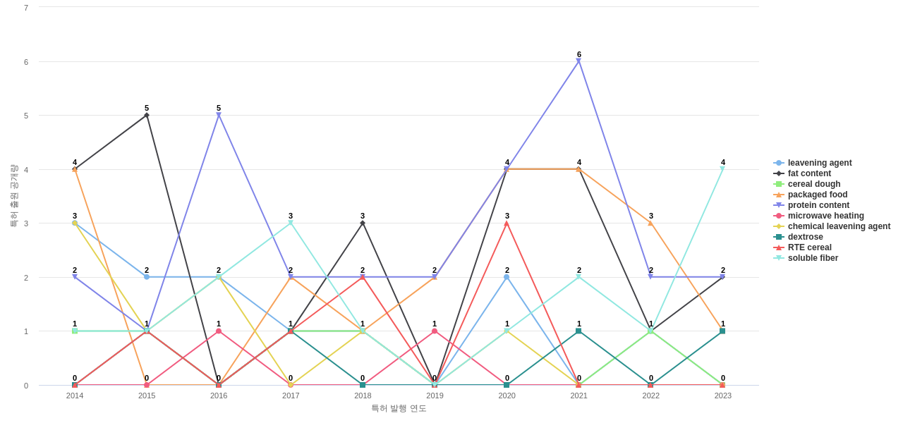 또한 inulin은 공개 특허수(31건), 등록 특허수(24건), 집중률(2.36%), 심사관 피인용수(59회), ornamental design for molded tortilla pocket은 공개 특허수 점유율(점유율_공개)(100.0%), shelf stable food는 매입 특허수(1건), 심사관 피인용수 점유율(점유율_FC-E)(5.7%), 해외 특허 패밀리수(해외 Fam.)(88개)에서 1위 입니다. high protein은 공개 특허수(24건), 등록 특허수(13건), 집중률(1.83%), 심사관 피인용수(49회), 심사관 피인용수 점유율(점유율_FC-E)(3.56%), molded tortilla pocket은 공개 특허수 점유율(점유율_공개)(100.0%), stable food는 매입 특허수(1건), 해외 특허 패밀리수(해외 Fam.)(88개)에서 2위 입니다. acid content는 심사관 피인용수(14회)에서 3위 입니다. nut butter는 공개 특허수(12건), 공개 특허수 점유율(점유율_공개)(4.62%), 집중률(0.92%), 심사관 피인용수 점유율(점유율_FC-E)(0.69%), erythritol은 해외 특허 패밀리수(해외 Fam.)(34개)에서 5위 입니다.
