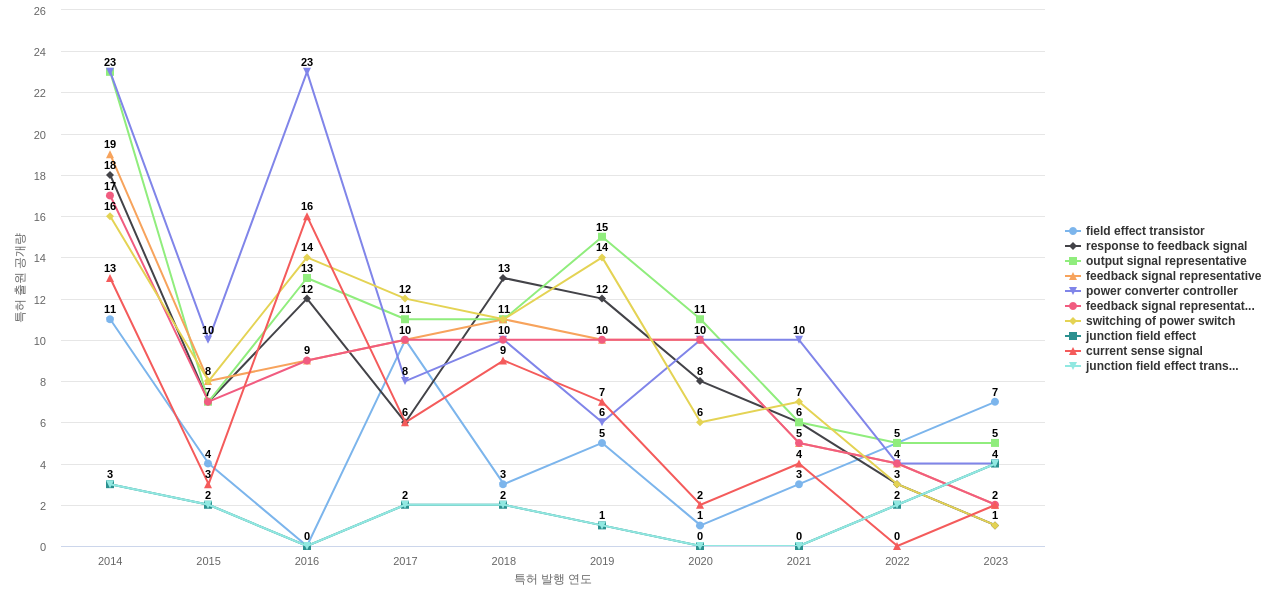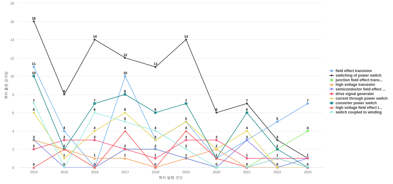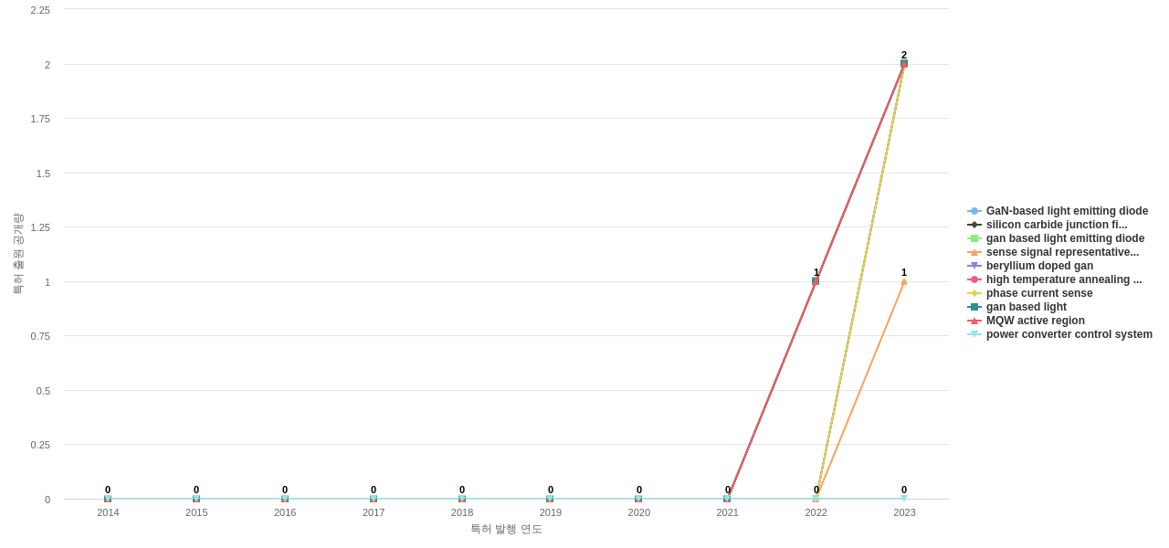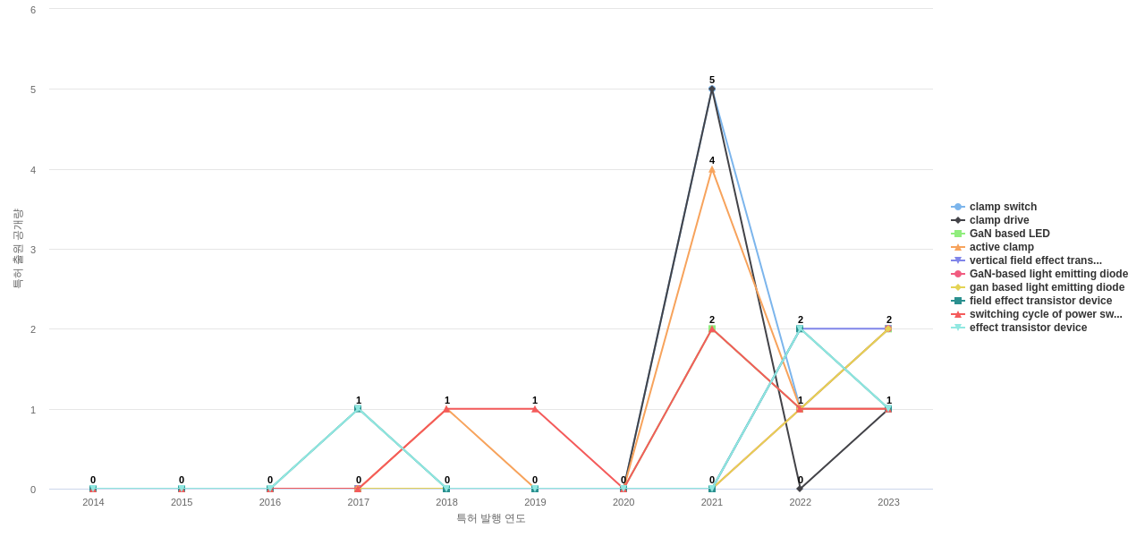 또한 enhancement mode는 공개 특허수(44건), 등록 특허수(41건), 집중률(3.5%), 매입 특허수(36건), 심사관 피인용수(156회), 해외 특허 패밀리수(해외 Fam.)(36개), current handling capability는 공개 특허수 점유율(점유율_공개)(5.88%), continuous conduction mode는 심사관 피인용수 점유율(점유율_FC-E)(2.38%)에서 1위 입니다. continuous conduction은 공개 특허수(23건), 등록 특허수(19건), 집중률(1.83%), 심사관 피인용수(79회), 심사관 피인용수 점유율(점유율_FC-E)(2.25%), 해외 특허 패밀리수(해외 Fam.)(34개), GaN based LED는 공개 특허수 점유율(점유율_공개)(3.82%)에서 2위 입니다. control turn on은 공개 특허수(18건), 등록 특허수(14건), 공개 특허수 점유율(점유율_공개)(3.51%), 집중률(1.43%), 심사관 피인용수(18회), 해외 특허 패밀리수(해외 Fam.)(21개), overlying n type는 매입 특허수(5건), clamp switch는 심사관 피인용수 점유율(점유율_FC-E)(1.51%)에서 4위 입니다. clamp drive는 심사관 피인용수 점유율(점유율_FC-E)(1.32%), active clamp는 해외 특허 패밀리수(해외 Fam.)(11개)에서 5위 입니다.