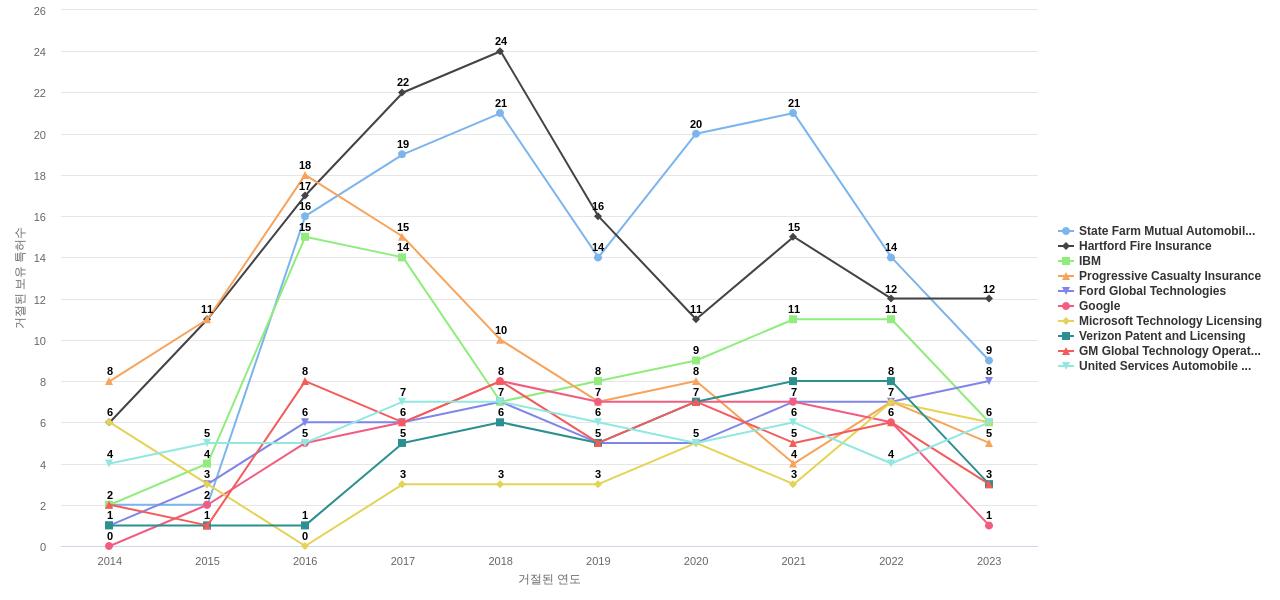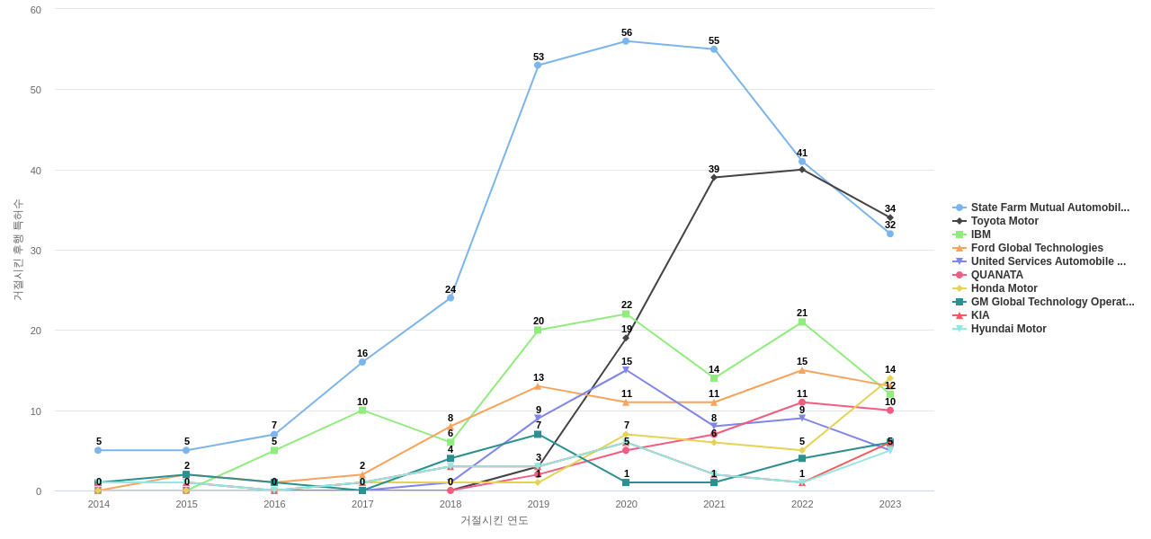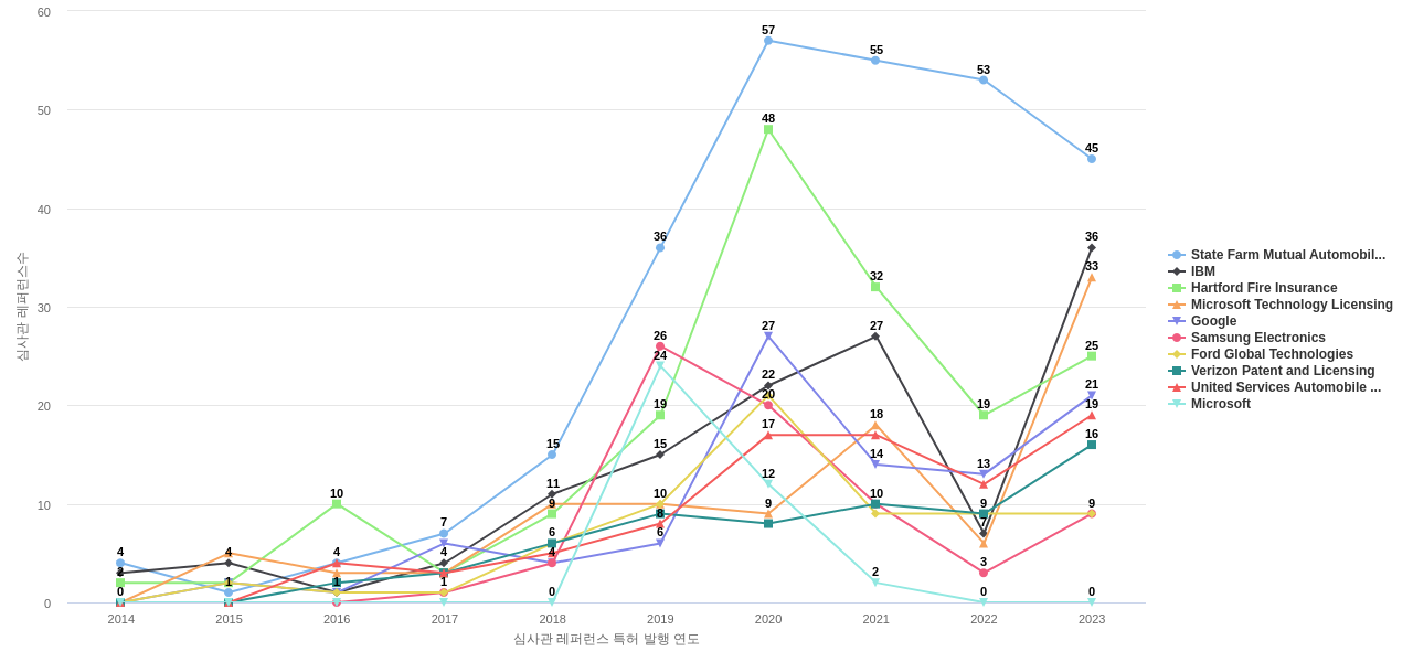 이 기업 보유 선행 특허가 받은 심사관 피인용수가 많은 관련 기업에는 1위 State Farm Mutual Automobile Insurance(374회), 2위 Toyota Motor(126회), 3위 IBM(98회) 등이 있습니다.