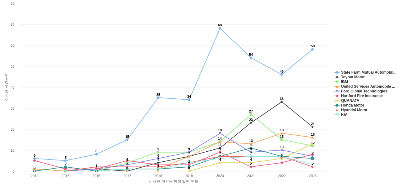 State Farm Mutual Automobile Insurance의 심사관 피인용수는 374회입니다. State Farm Mutual Automobile Insurance의 심사관 피인용수는 11년 이전부터 발생하기 시작하여 2020년에 68회의 최고값을 보입니다. 그리고, 이 값은 이번 연도인 2024년에는 44회, 1년 전인 2023년에는 58회, 2년 전인 2022년에는 46회를 보입니다.