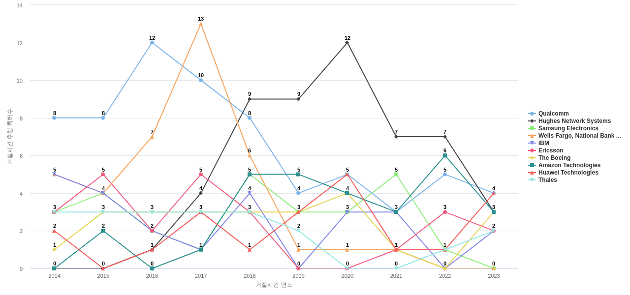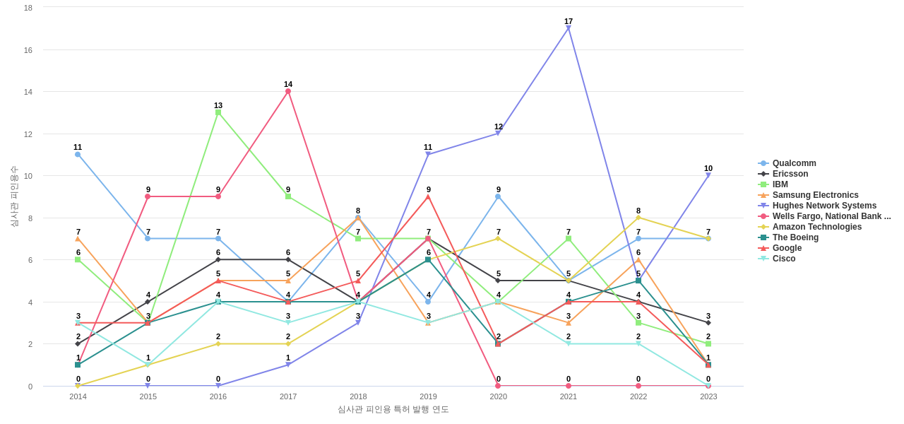 Qualcomm의 심사관 피인용수는 97회입니다. Qualcomm의 심사관 피인용수는 11년 이전부터 발생하기 시작하여 2014년에 11회의 최고값을 보입니다. 그리고, 이 값은 이번 연도인 2024년에는 8회, 1년 전인 2023년에는 7회, 2년 전인 2022년에는 7회를 보입니다.
