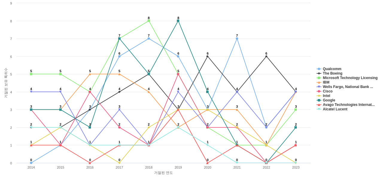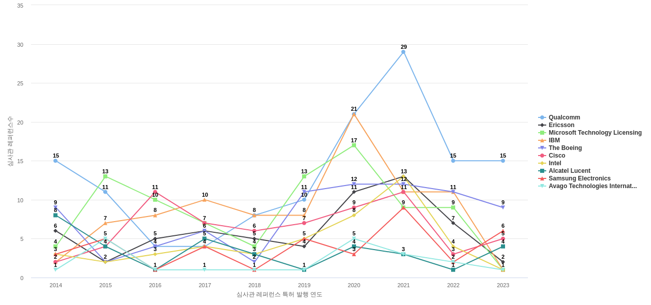 이 기업 보유 선행 특허가 받은 심사관 피인용수가 많은 관련 기업에는 1위 Qualcomm(97회), 2위 Ericsson(79회), 3위 IBM(69회) 등이 있습니다.