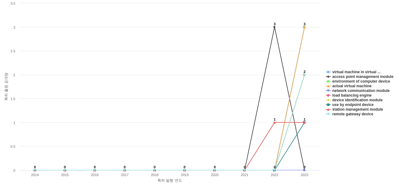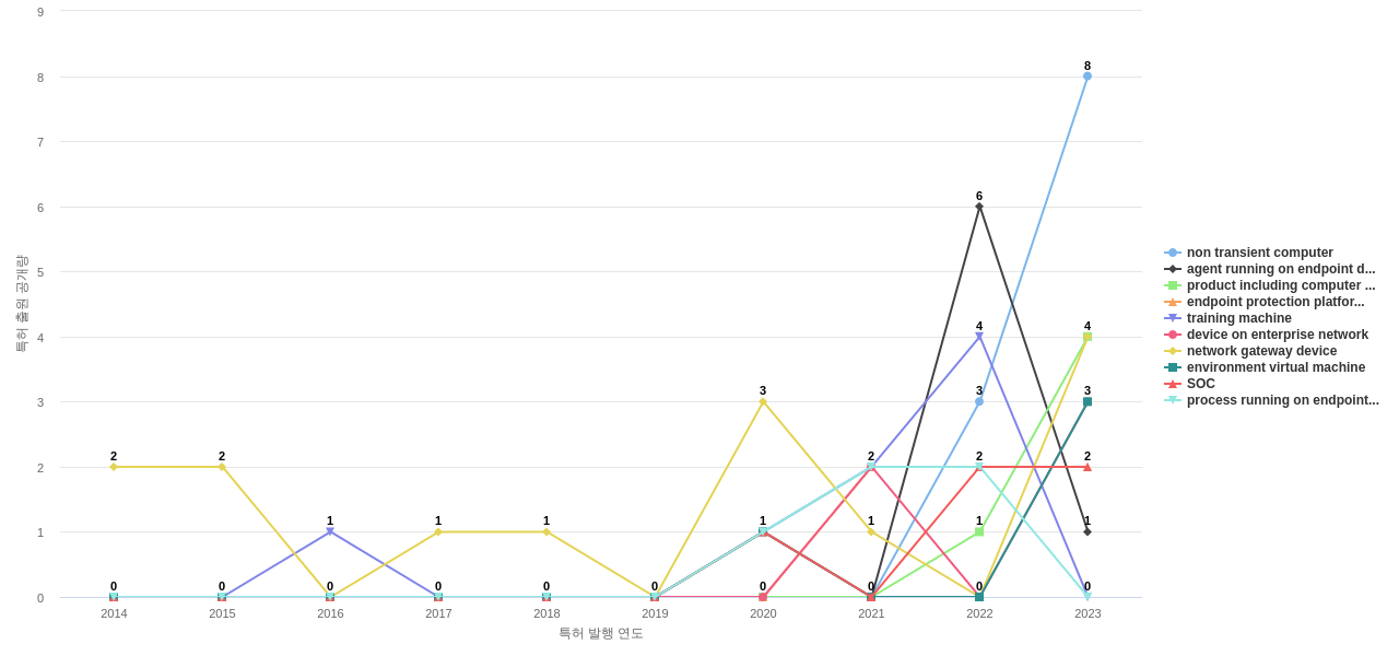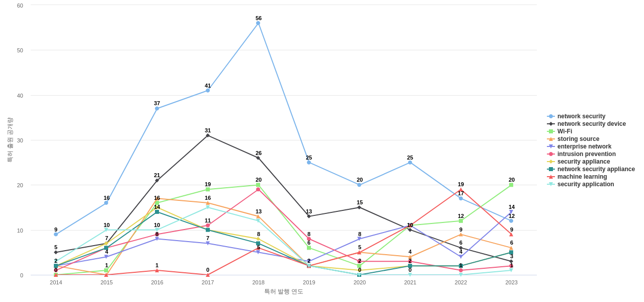 network security device의 공개 특허수의 2014년부터 2023년까지, 지난 9년간 연평균 성장률은 -0.06%로, 완만하게 감소하고 있습니다.