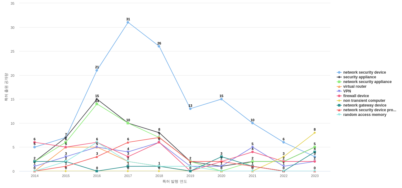 network security device의 공개 특허수는 142건입니다. network security device의 공개 특허수는 2014년에 5건으로 최초 발생하여, 2017년에 31건의 최고값을 보입니다. 그리고, 이 값은 이번 연도인 2024년에는 5건, 1년 전인 2023년에는 3건, 2년 전인 2022년에는 6건을 보입니다.