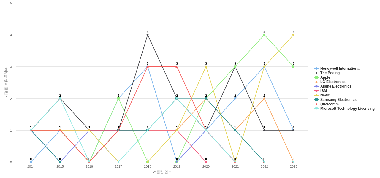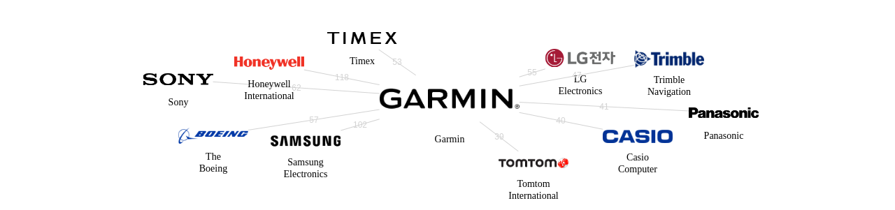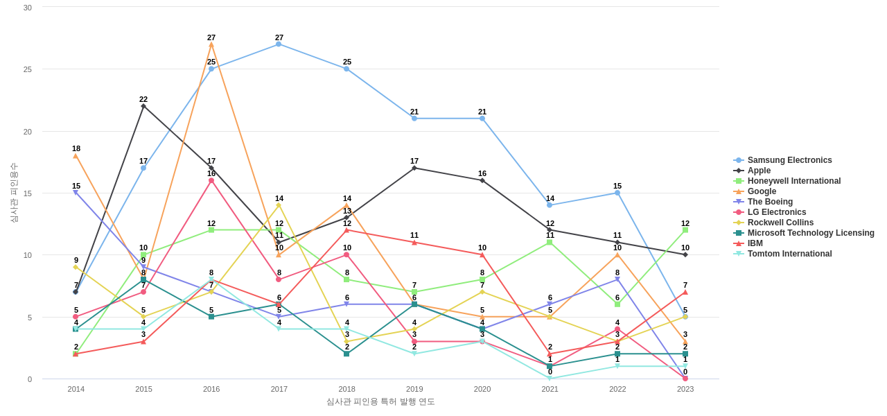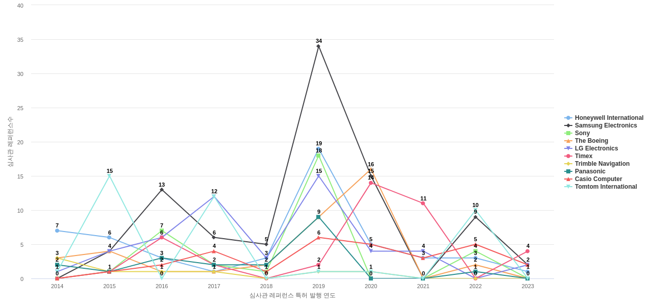 이 기업 보유 선행 특허가 받은 심사관 피인용수가 많은 관련 기업에는 1위 Samsung Electronics(264회), 2위 Apple(164회), 3위 Honeywell International(154회) 등이 있습니다.