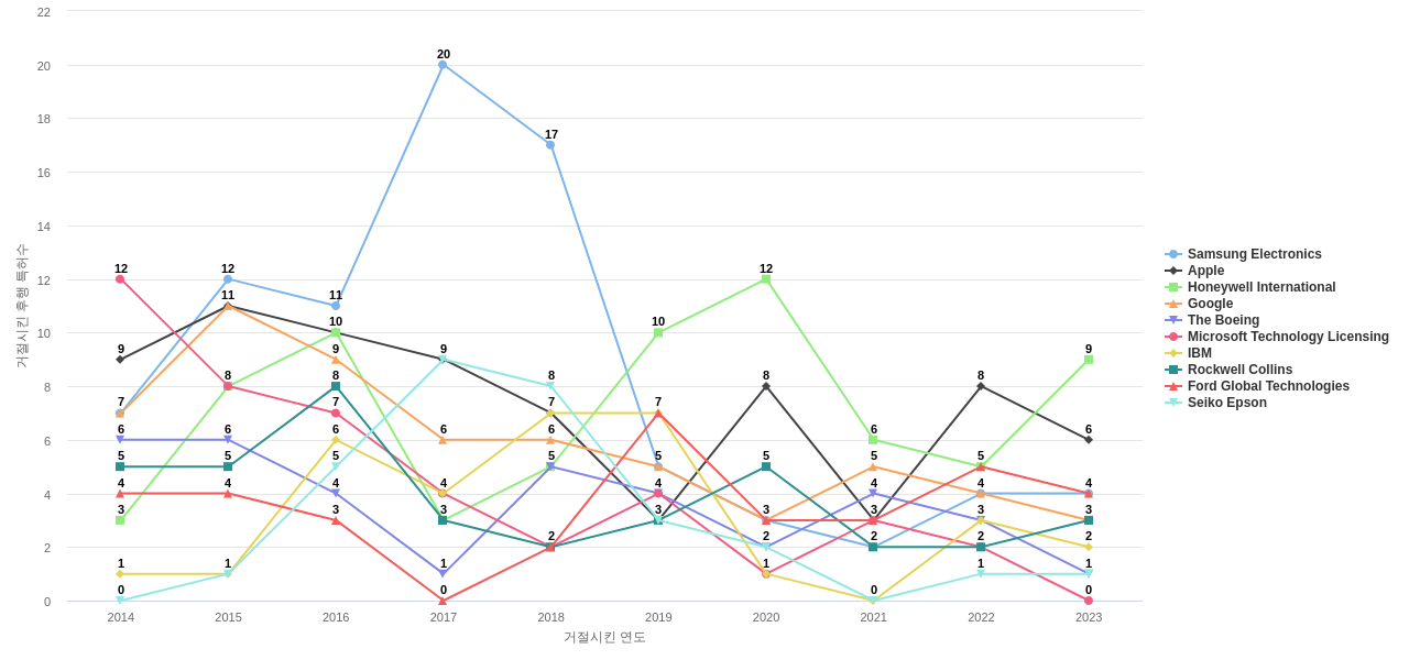 Samsung Electronics의 심사관 피인용수는 264회입니다. Samsung Electronics의 심사관 피인용수는 11년 이전부터 발생하기 시작하여 2017년에 27회의 최고값을 보입니다. 그리고, 이 값은 이번 연도인 2024년에는 11회, 1년 전인 2023년에는 5회, 2년 전인 2022년에는 15회를 보입니다.