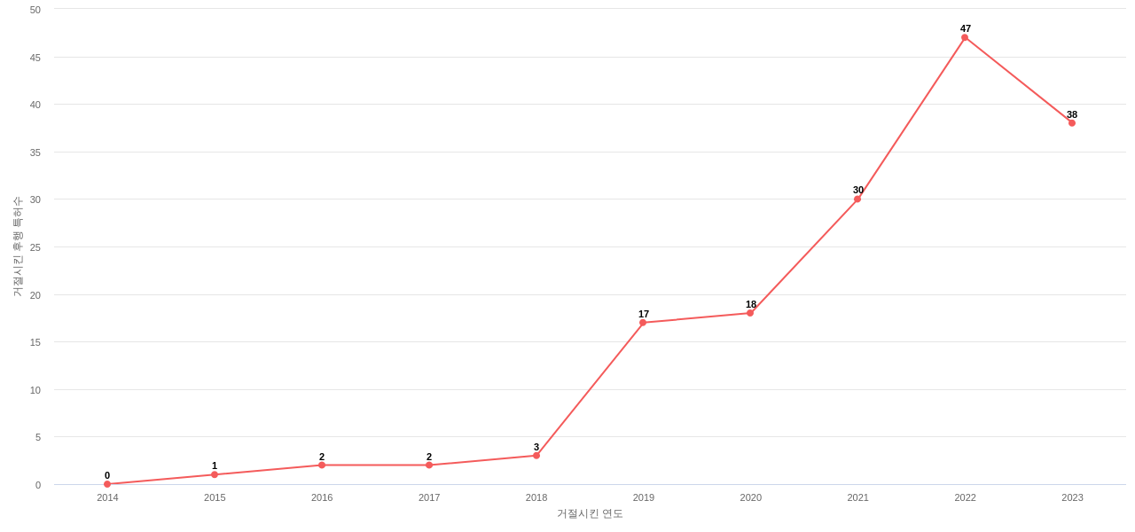 2) Yeti Coolers가 보유하고 있는 특허가, i) 후속 특허에 의해 많이 인용되고 있는지(기술 영향력), ii) 후속 특허를 거절하는데 다수 사용되고 있는 지(기술 리더십)를 통해서, 이 기업의 기술 역량을 분석해 보세요. 특히, 이러한 동향이 최근에 빠르게 증가하고 있는지도 확인하세요.