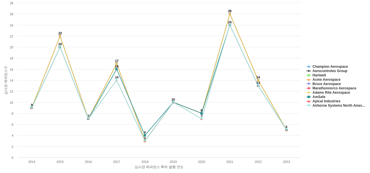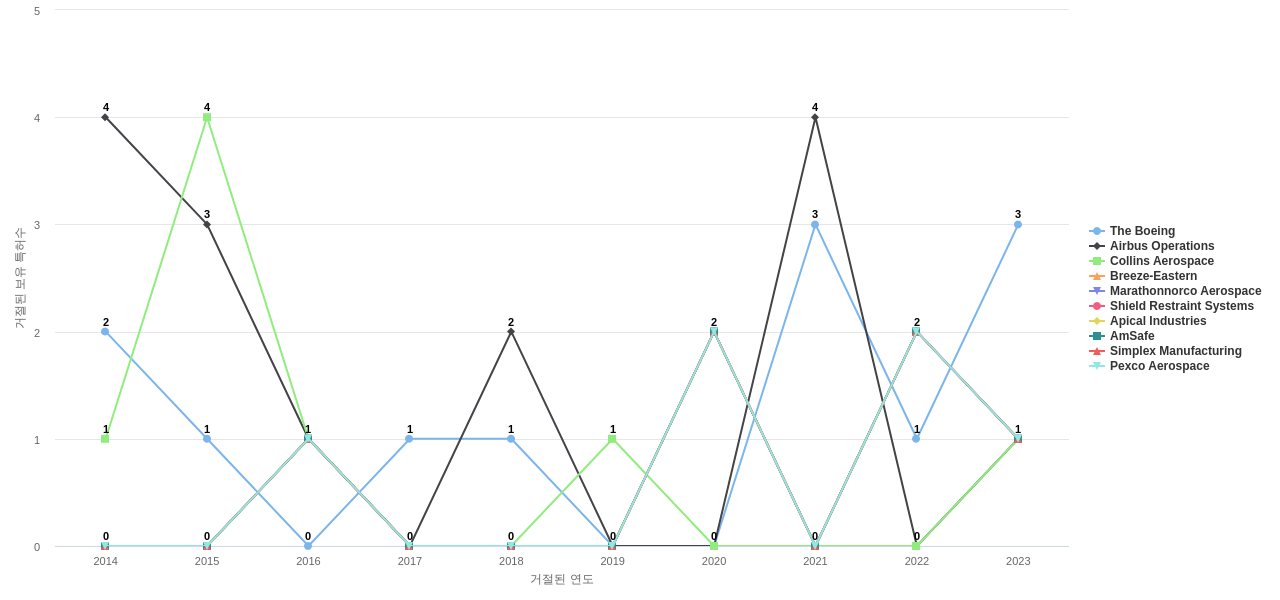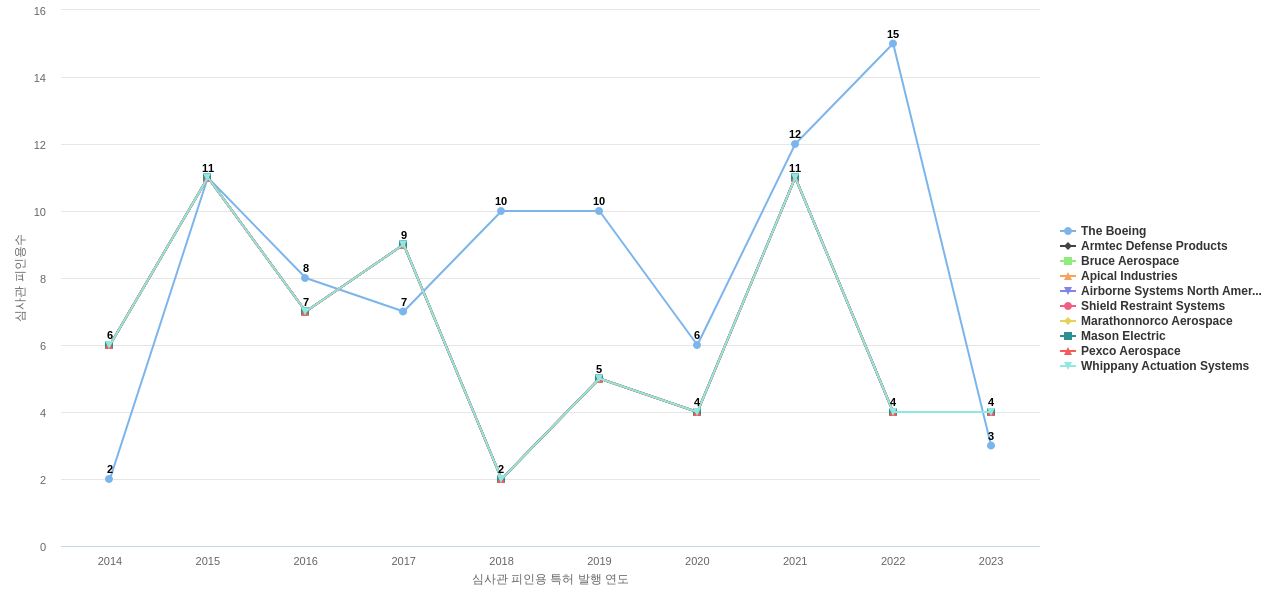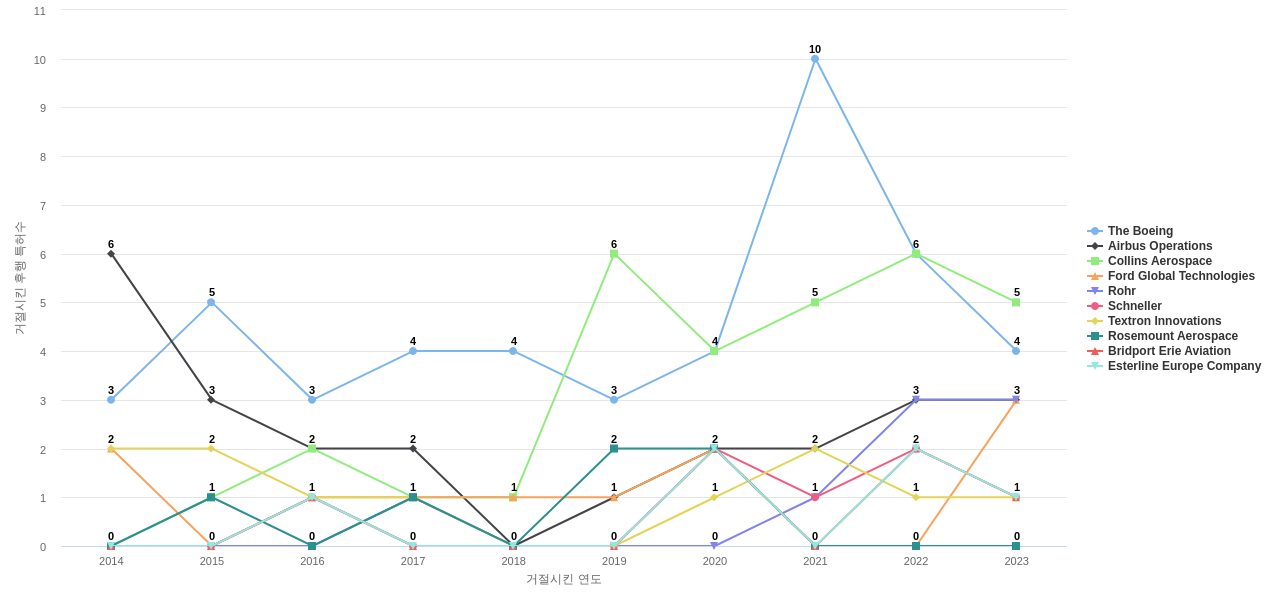 이 기업 보유 선행 특허가 받은 심사관 피인용수가 많은 관련 기업에는 1위 The Boeing(127회), 2위 Armtec Defense Products(118회), 3위 Bruce Aerospace(118회) 등이 있습니다.
