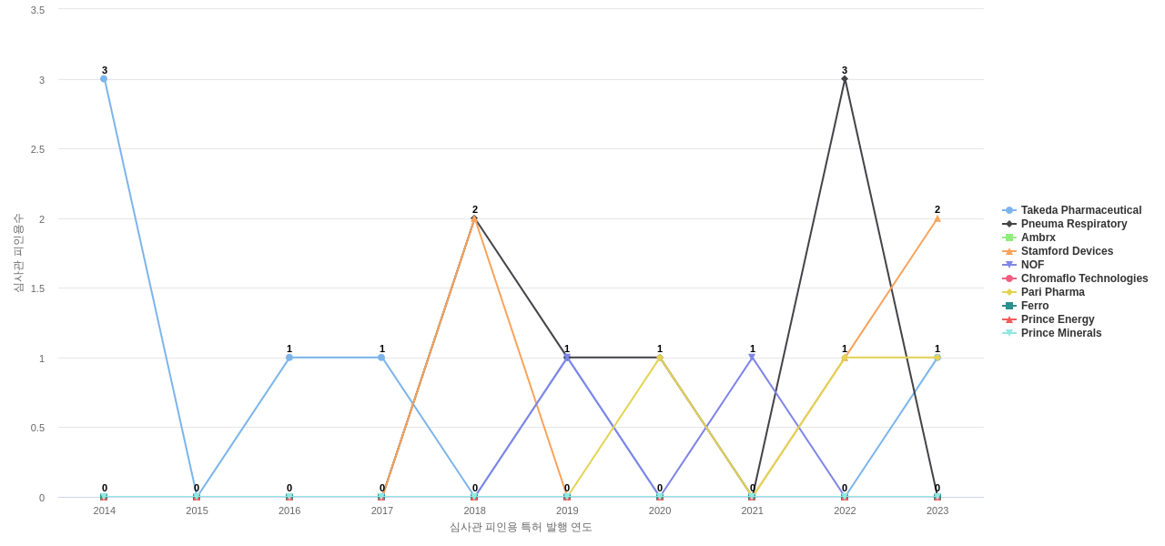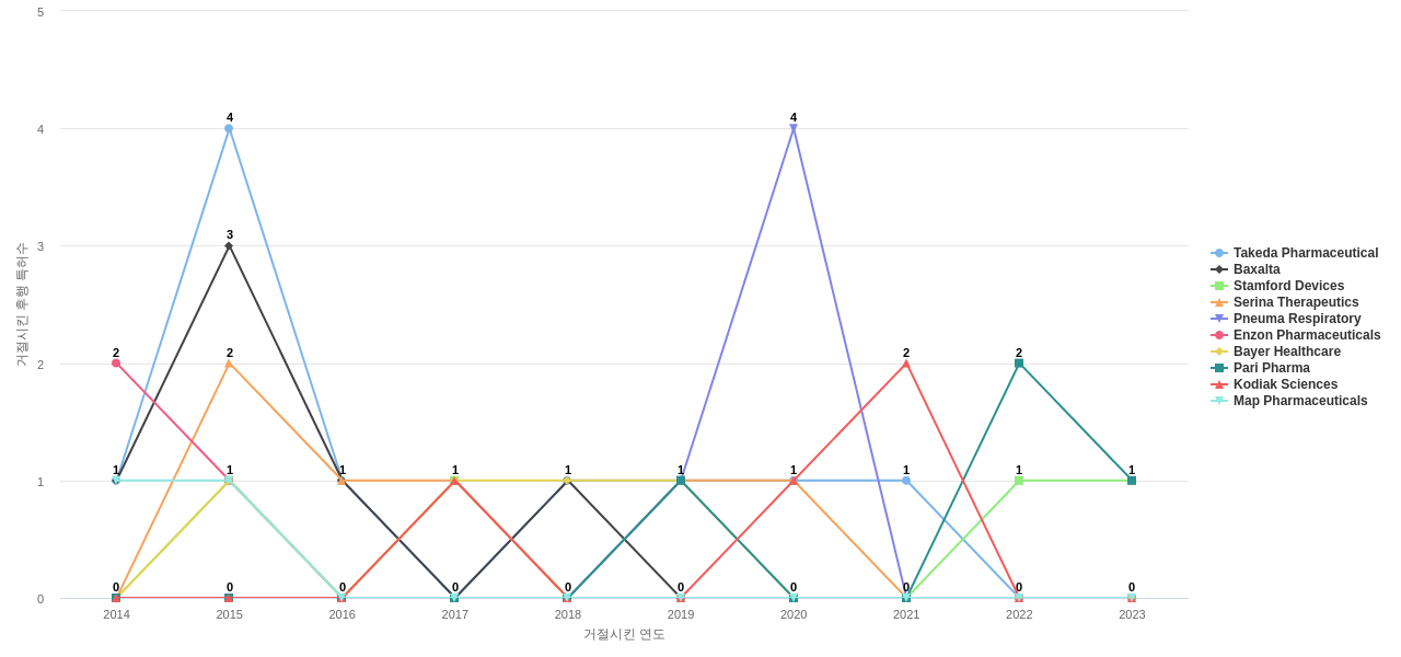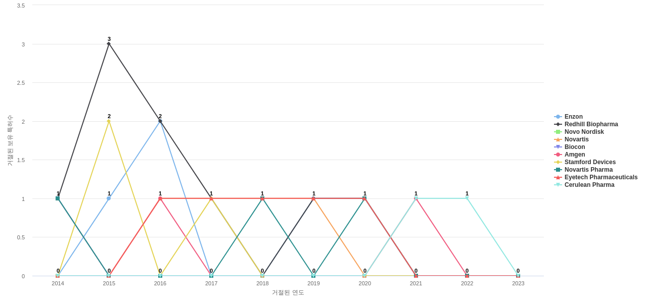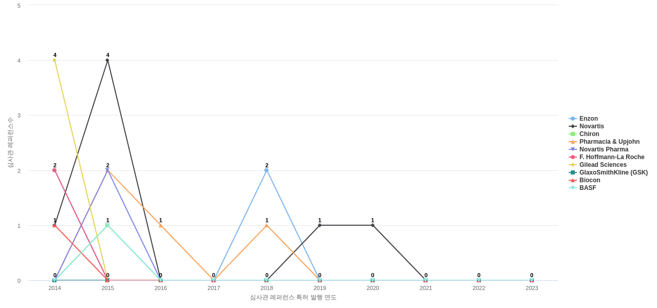 이 기업 보유 후행 특허가 참조하는 심사관 레퍼런스수가 많은 관련 기업에는 1위 Enzon(15회), 2위 Novartis(8회), 3위 Chiron(6회) 등이 있습니다.
