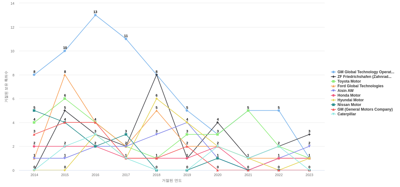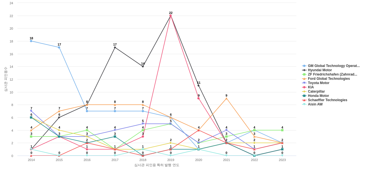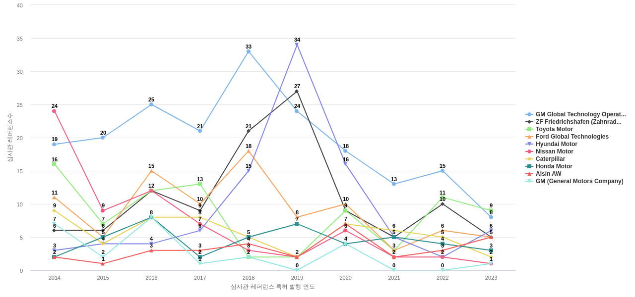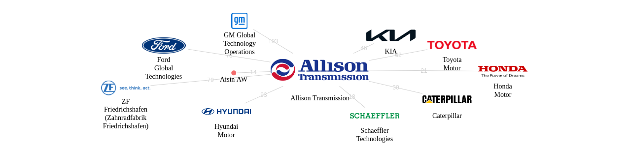 이 기업 보유 후행 특허가 참조하는 심사관 레퍼런스수가 많은 관련 기업에는 1위 GM Global Technology Operations(222회), 2위 ZF Friedrichshafen (Zahnradfabrik Friedrichshafen)(120회), 3위 Toyota Motor(104회) 등이 있습니다.