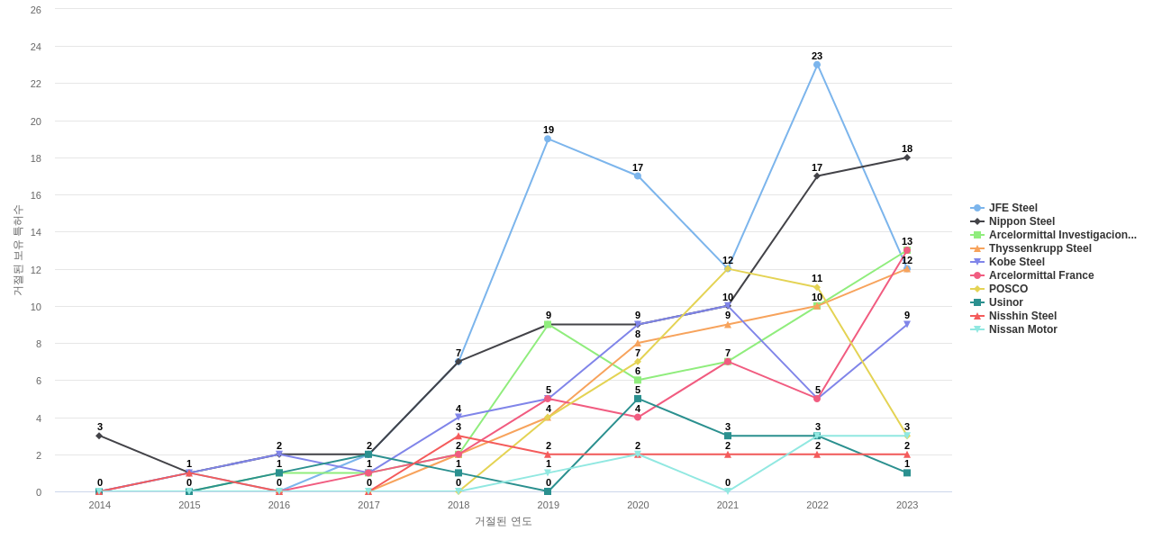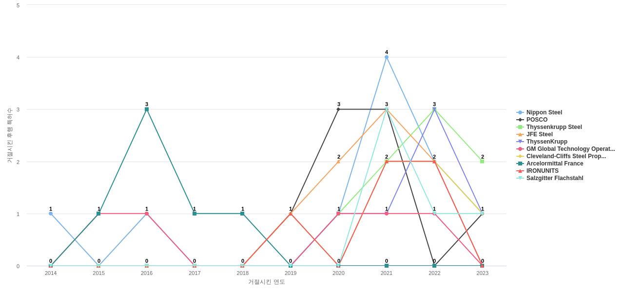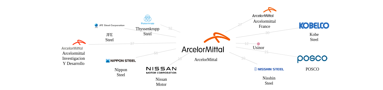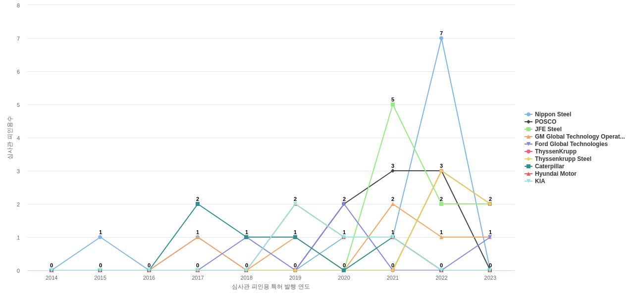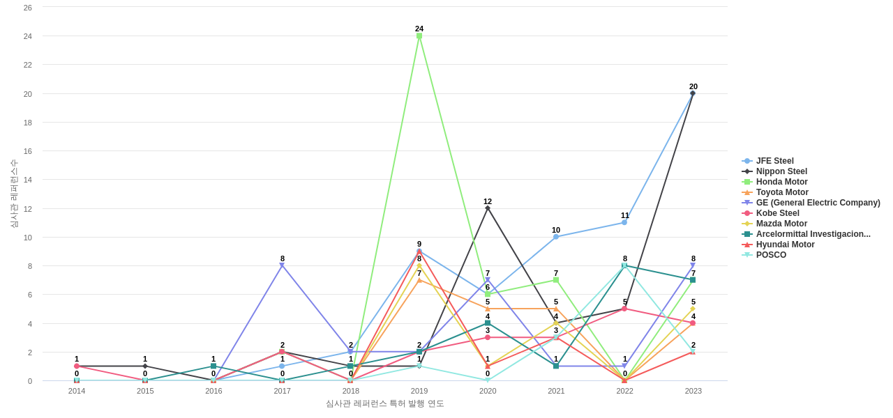 이 기업 보유 후행 특허가 참조하는 심사관 레퍼런스수가 많은 관련 기업에는 1위 JFE Steel(56회), 2위 Nippon Steel(52회), 3위 Honda Motor(44회) 등이 있습니다.