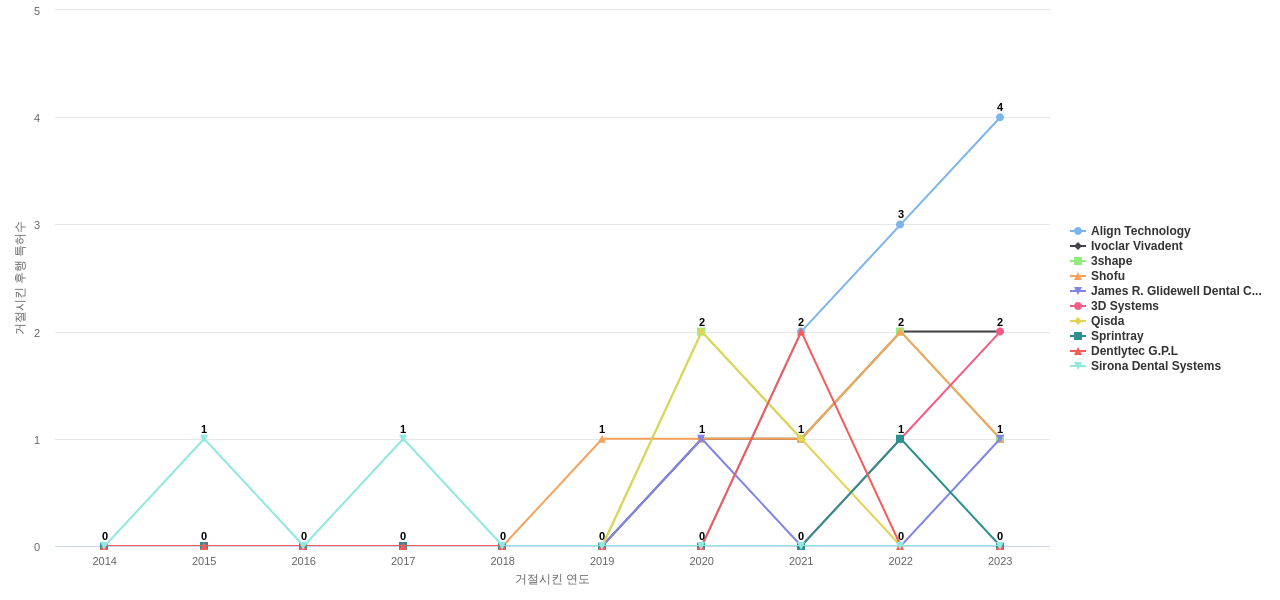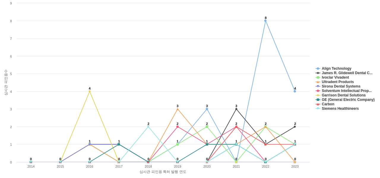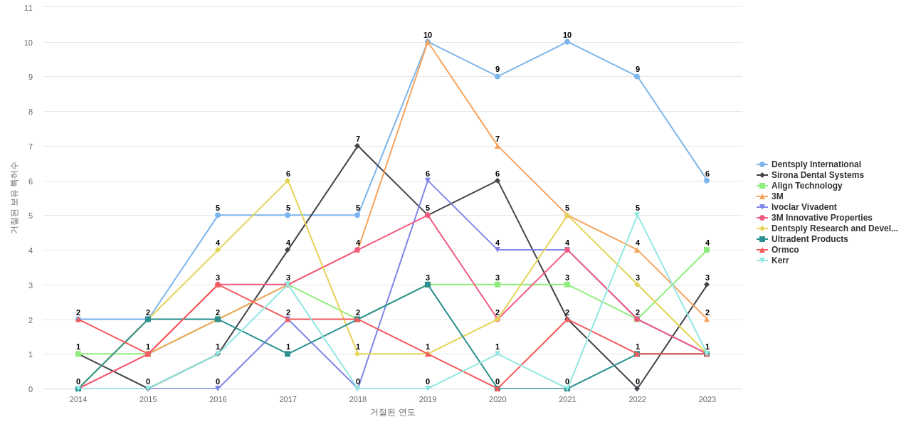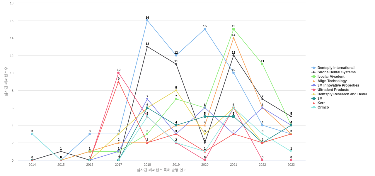 이 기업 보유 후행 특허가 참조하는 심사관 레퍼런스수가 많은 관련 기업에는 1위 Dentsply International(67회), 2위 Sirona Dental Systems(46회), 3위 Ivoclar Vivadent(45회) 등이 있습니다.