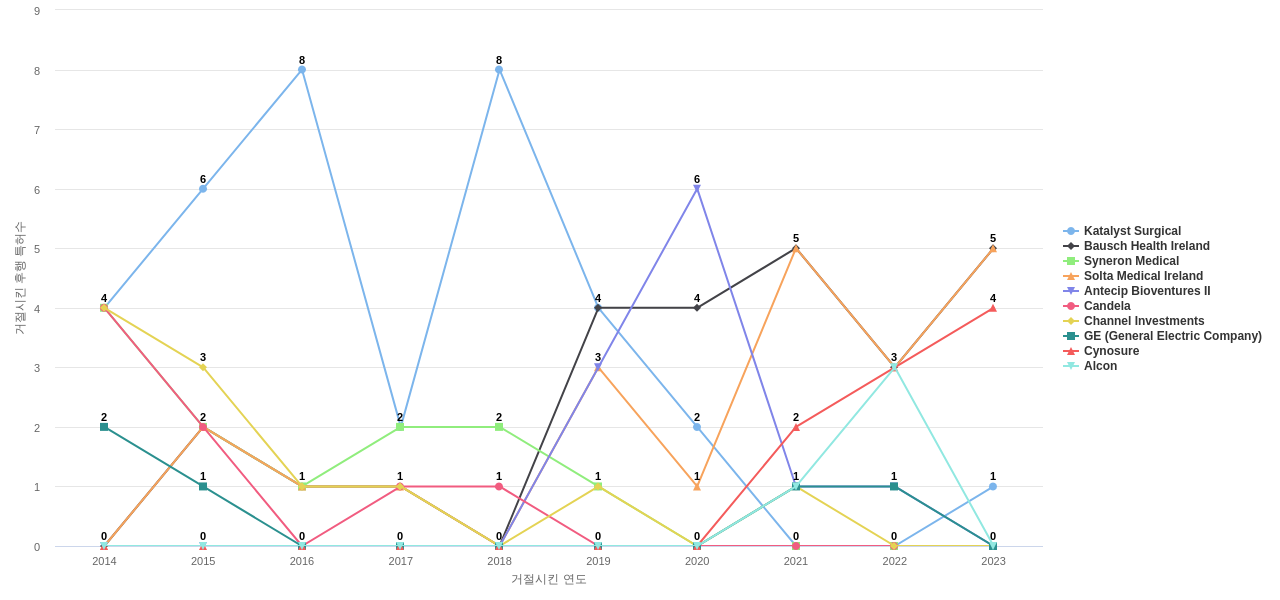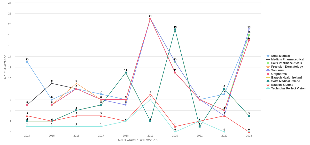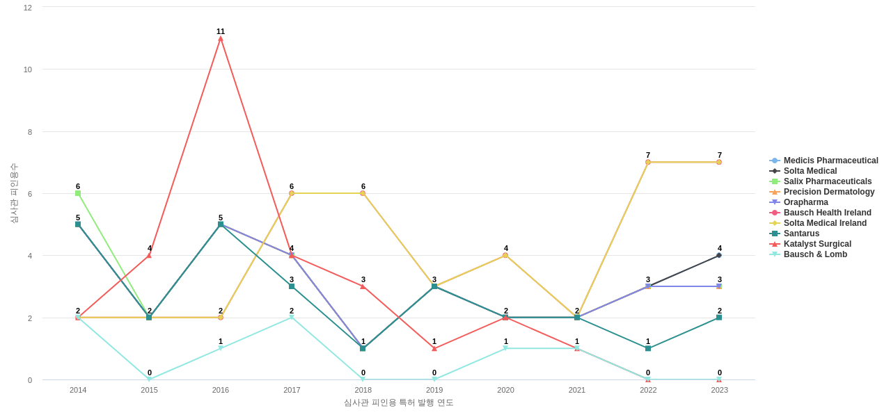 이 기업 보유 선행 특허가 받은 심사관 피인용수가 많은 관련 기업에는 1위 Medicis Pharmaceutical(60회), 2위 Solta Medical(59회), 3위 Salix Pharmaceuticals(57회) 등이 있습니다.