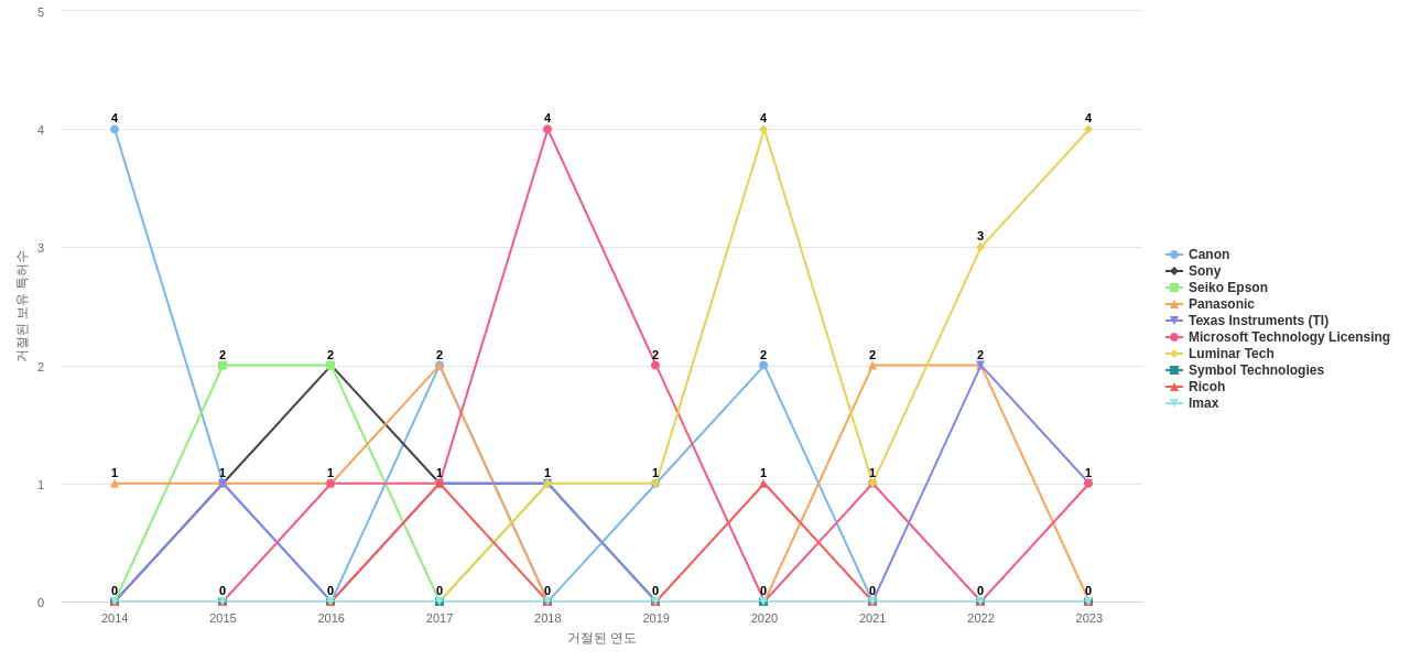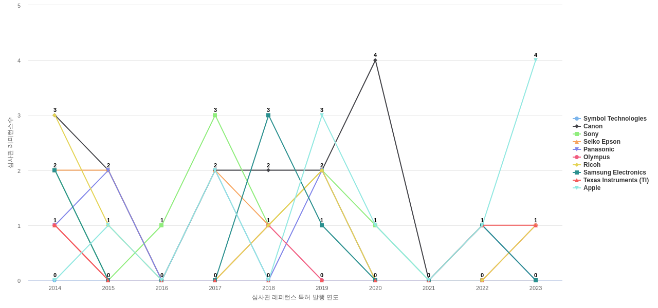 Seiko Epson의 심사관 피인용수는 59회입니다. Seiko Epson의 심사관 피인용수는 최근 11년 이전에 22회, 최근 11년 동안에는 37회로 총 59회를 보이며, 2017년에 8회의 최고값을 보입니다. 그리고, 이 값은 이번 연도인 2024년에는 0회, 1년 전인 2023년에는 2회, 2년 전인 2022년에는 2회를 보입니다.