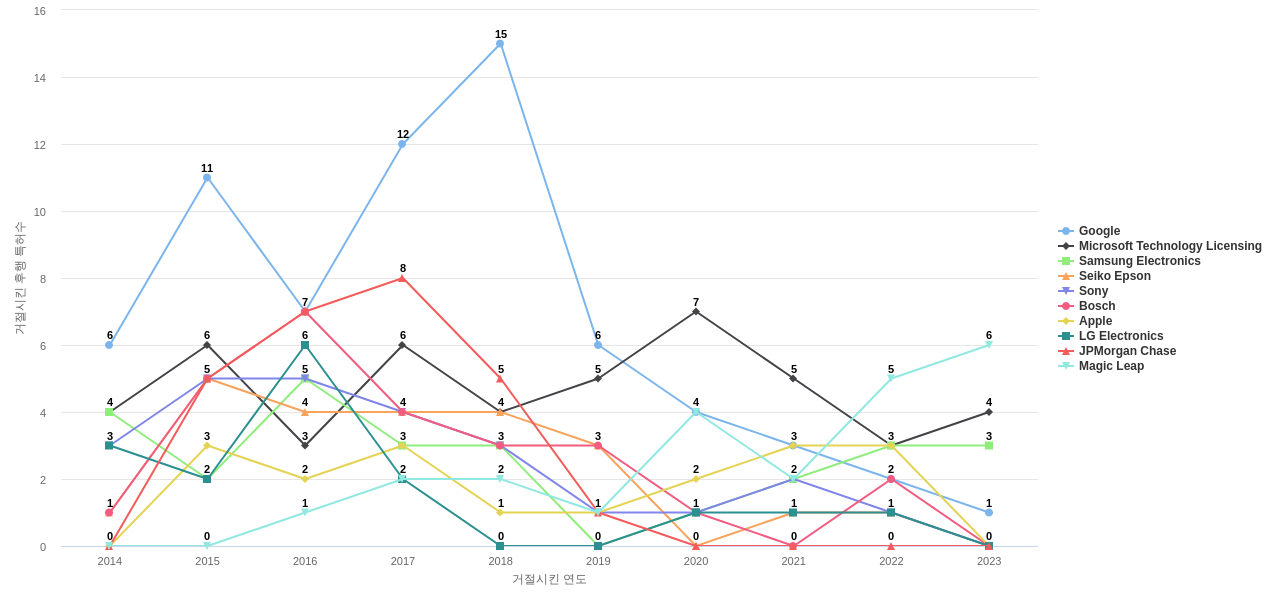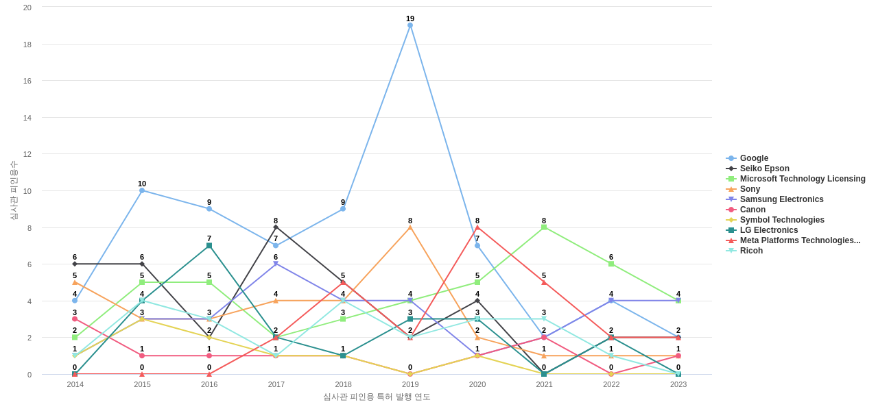 Google의 심사관 피인용수는 79회입니다. Google의 심사관 피인용수는 11년 이전부터 발생하기 시작하여 2019년에 19회의 최고값을 보입니다. 그리고, 이 값은 이번 연도인 2024년에는 1회, 1년 전인 2023년에는 2회, 2년 전인 2022년에는 4회를 보입니다.