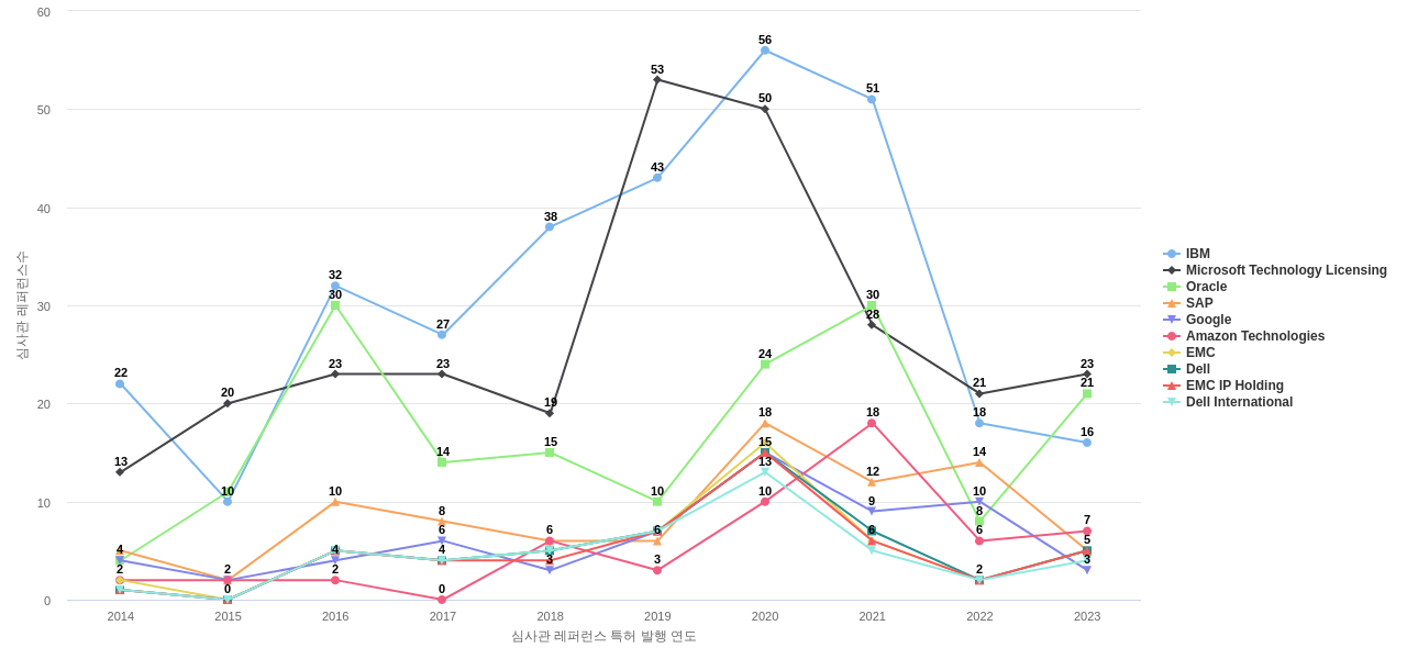 IBM의 심사관 레퍼런스수는 364회입니다. IBM의 심사관 레퍼런스수는 11년 이전부터 발생하기 시작하여 2020년에 56회의 최고값을 보입니다. 그리고, 이 값은 이번 연도인 2024년에는 14회, 1년 전인 2023년에는 16회, 2년 전인 2022년에는 18회를 보입니다.