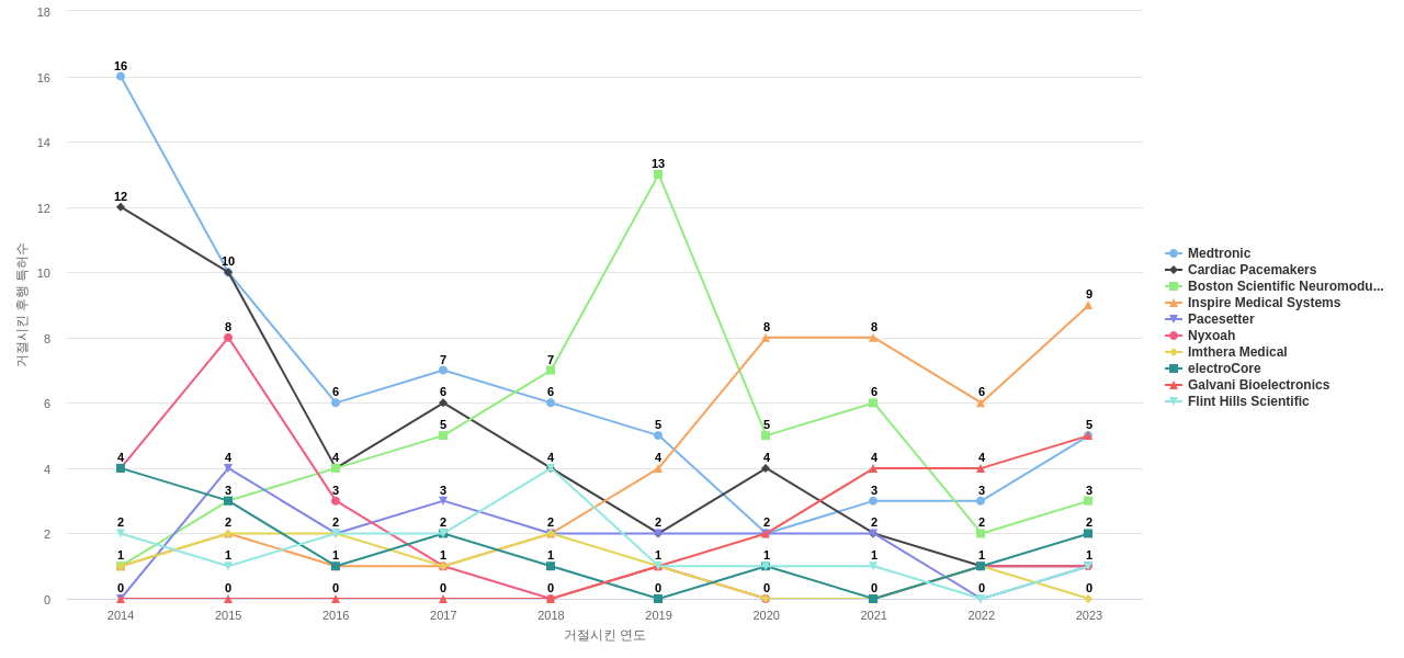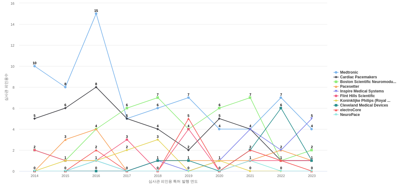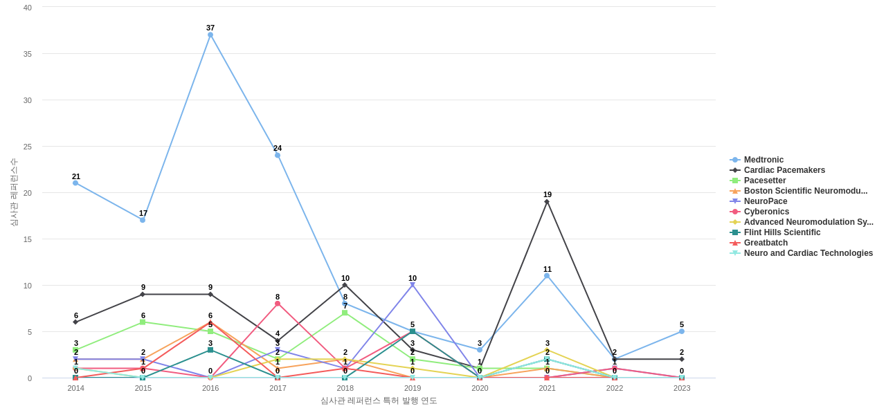 이 기업 보유 선행 특허가 받은 심사관 피인용수가 많은 관련 기업에는 1위 Medtronic(145회), 2위 Cardiac Pacemakers(77회), 3위 Boston Scientific Neuromodulation(52회) 등이 있습니다.